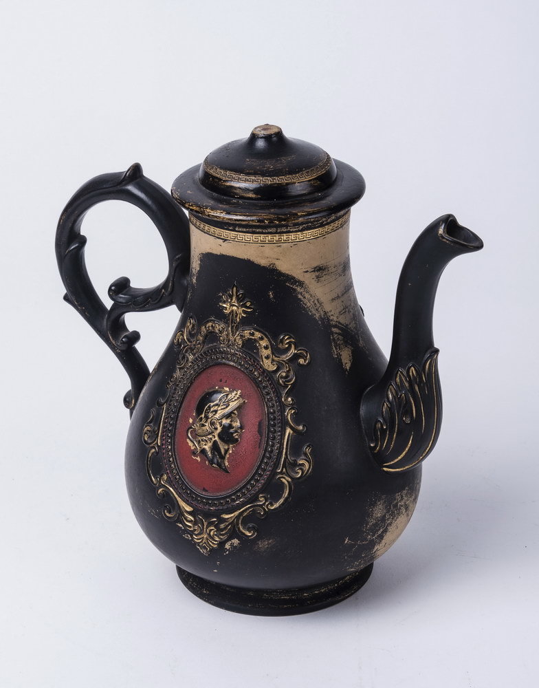 Koffiepot, zwart gesausd, geelbakkend aardewerk, Eng...