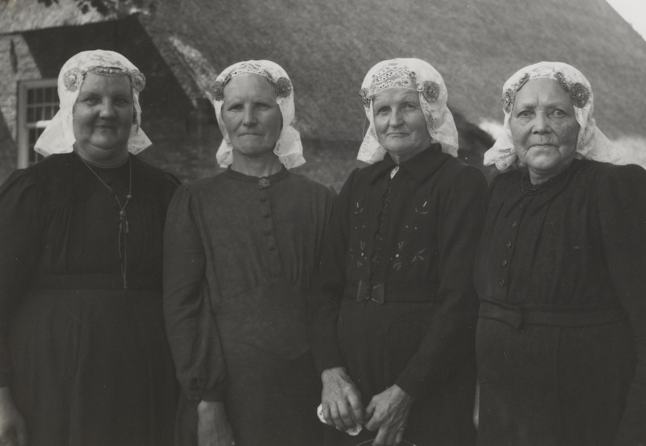 Vier vrouwen in Drentse dracht, 1950 (zwart-wit foto)