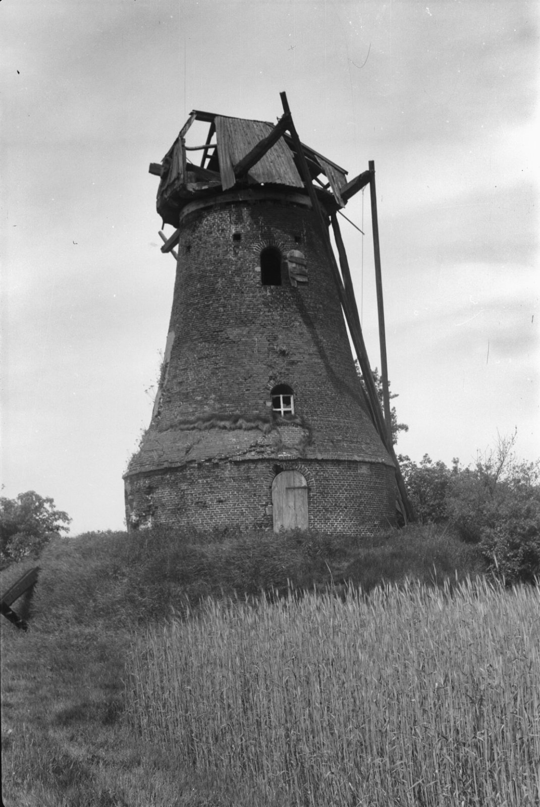 Romp van ontwiekte ronde stenen beltmolen in vervall...
