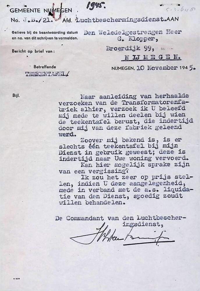Luchtbeschermingsdienst Nijmegen 1945-1946. Brief va...