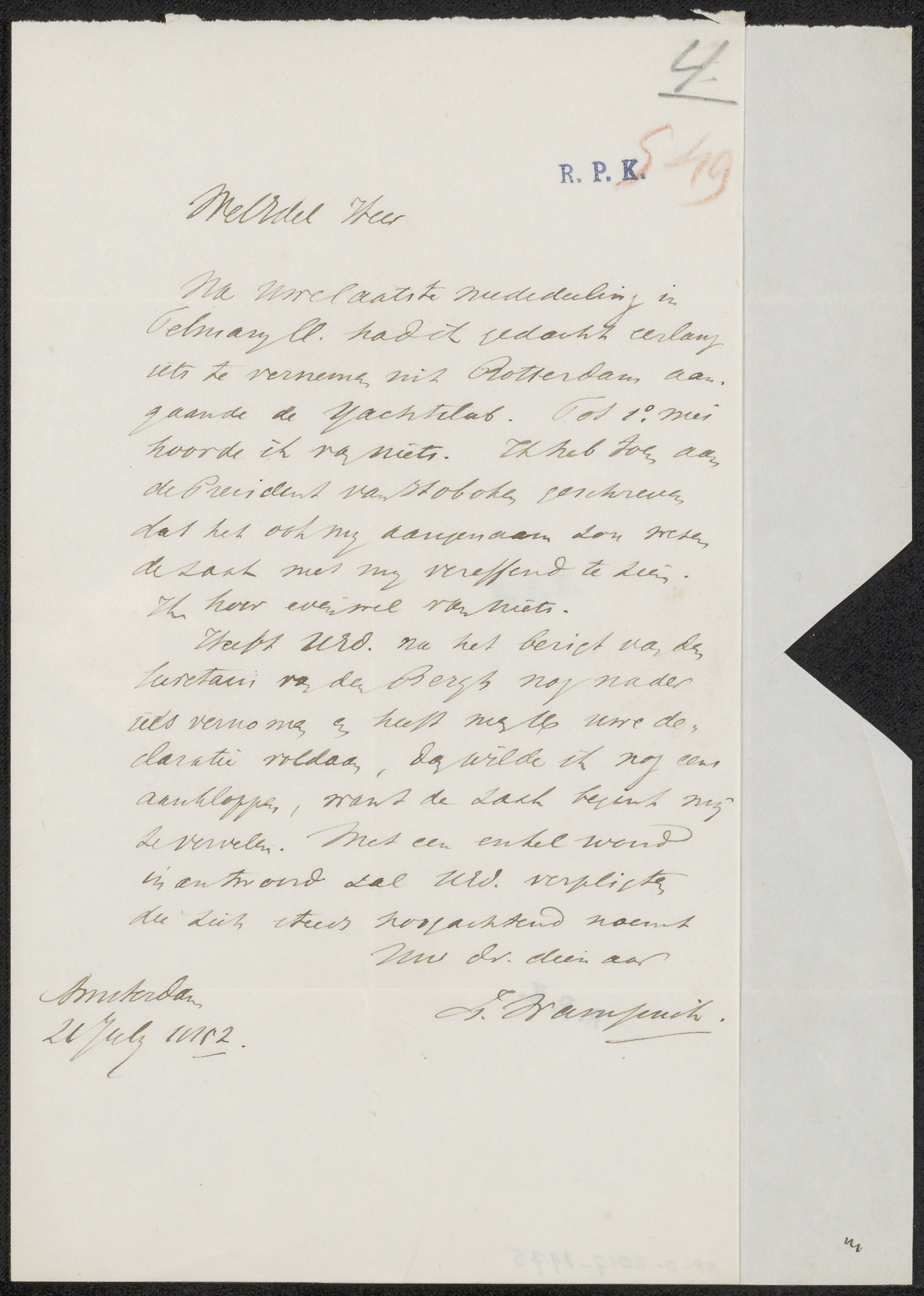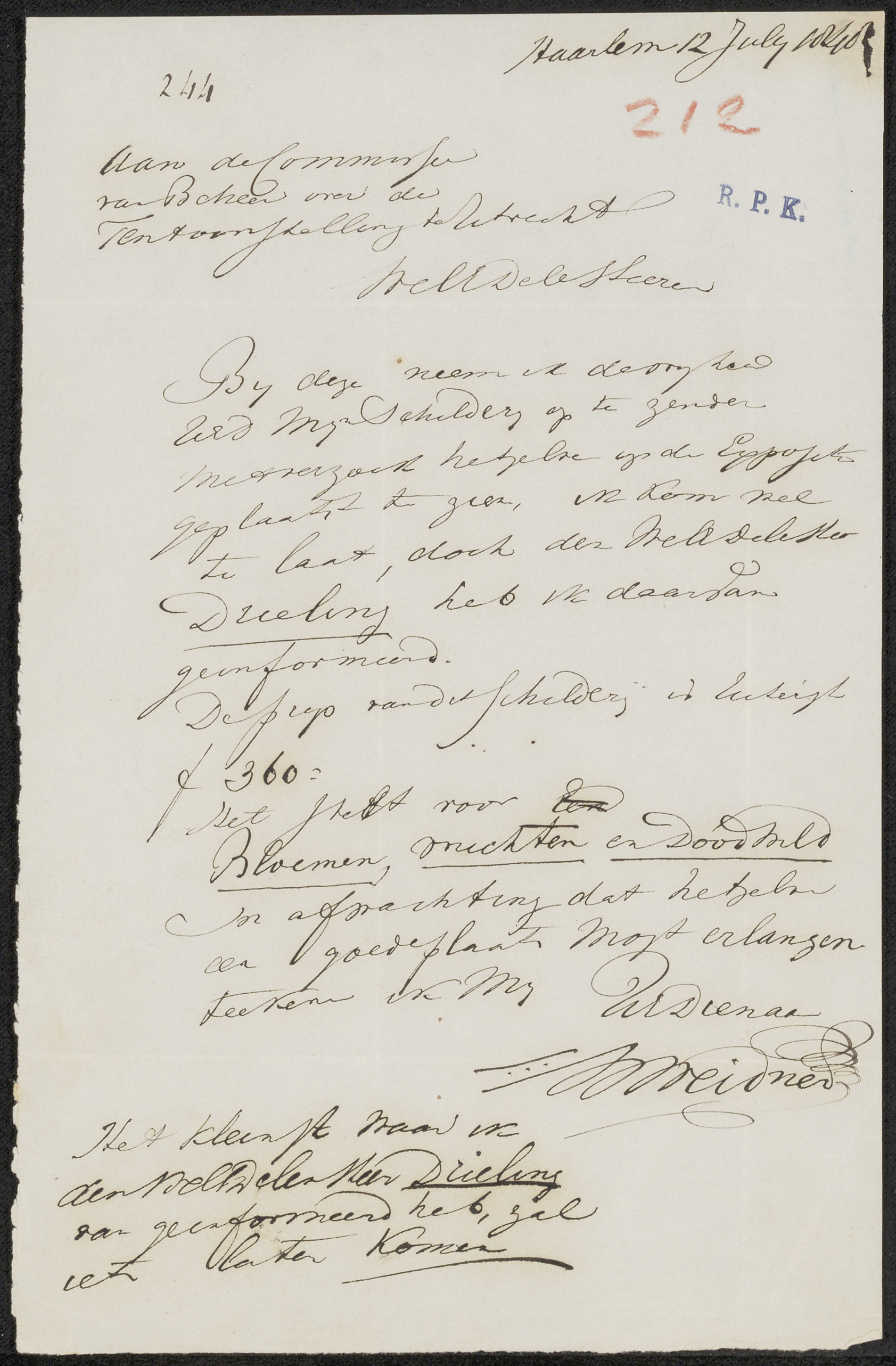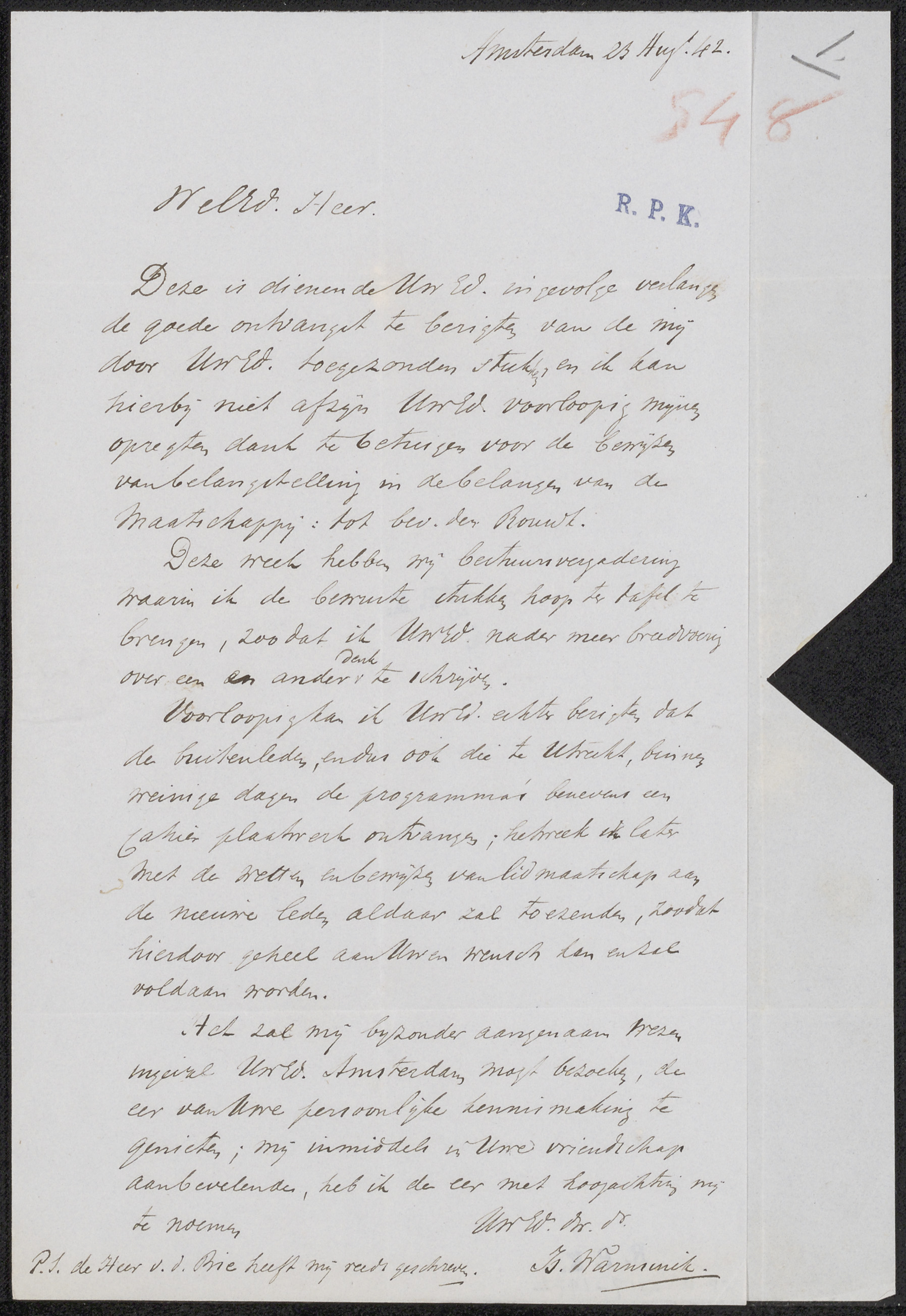 Brief aan jonkheer H.P.F. Hooft, secretaris van de c...