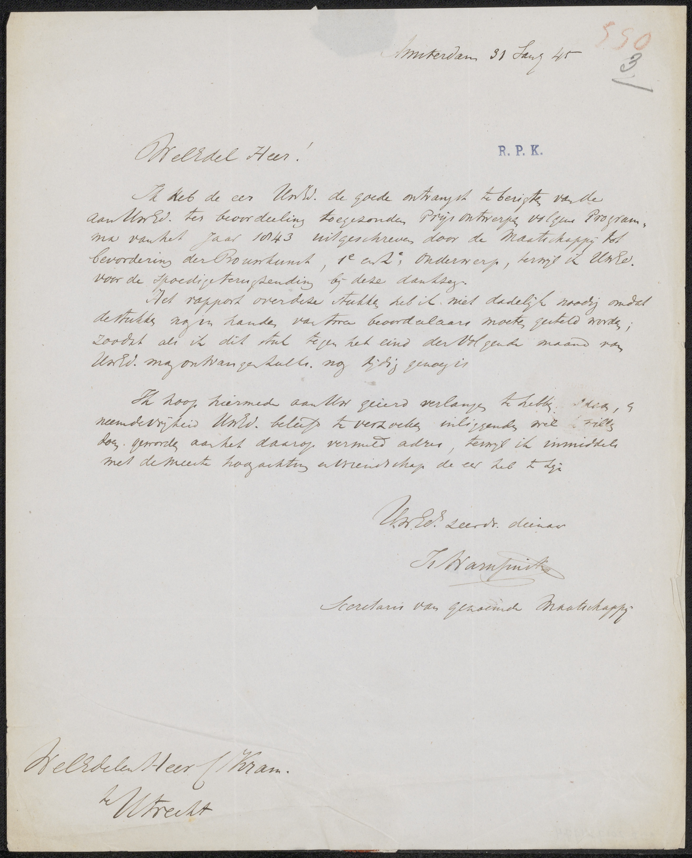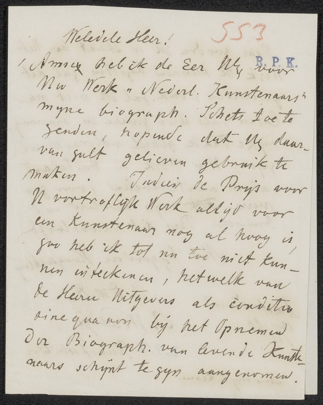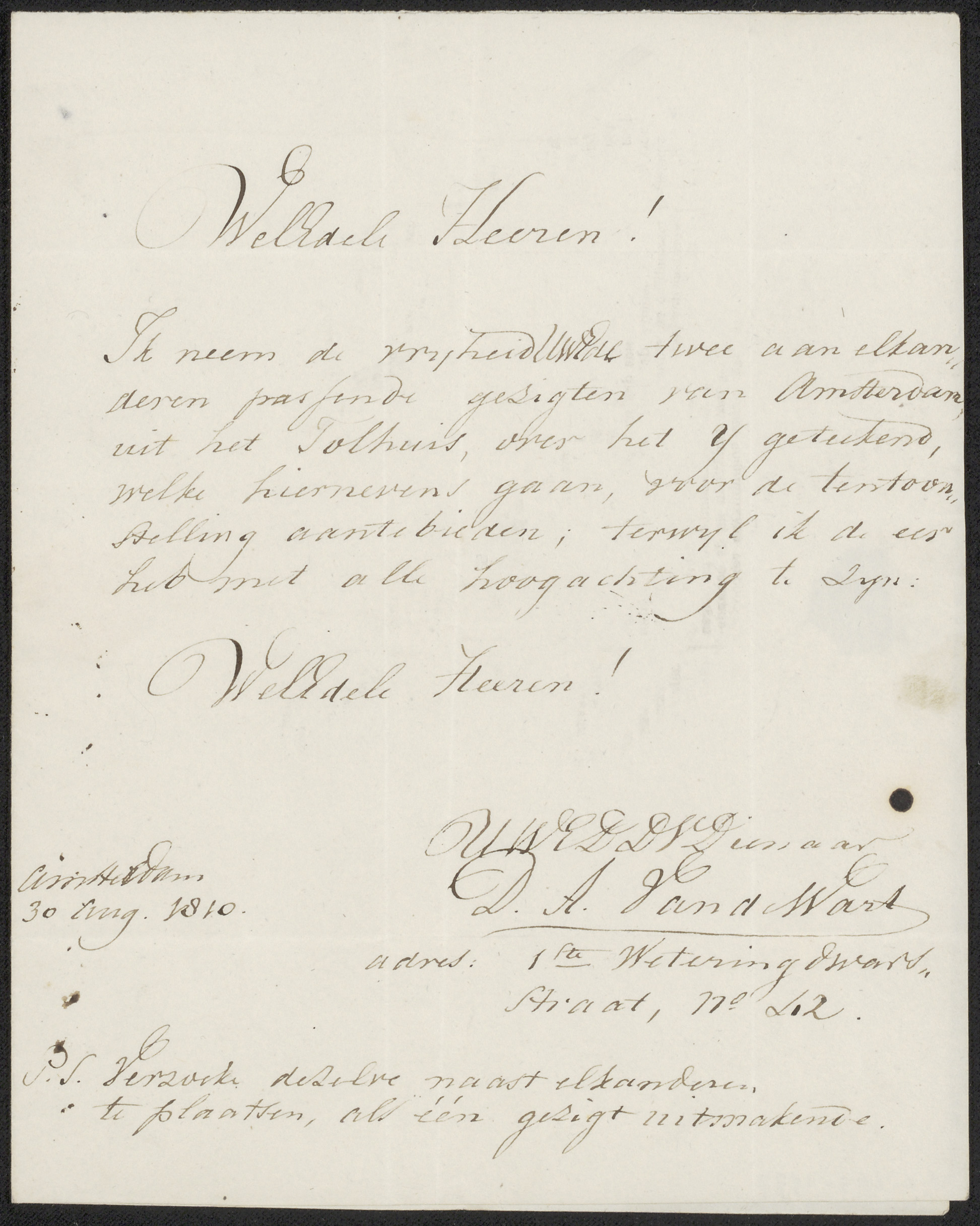 Brief aan jonkheer H.P.F. Hooft, secretaris van de c...