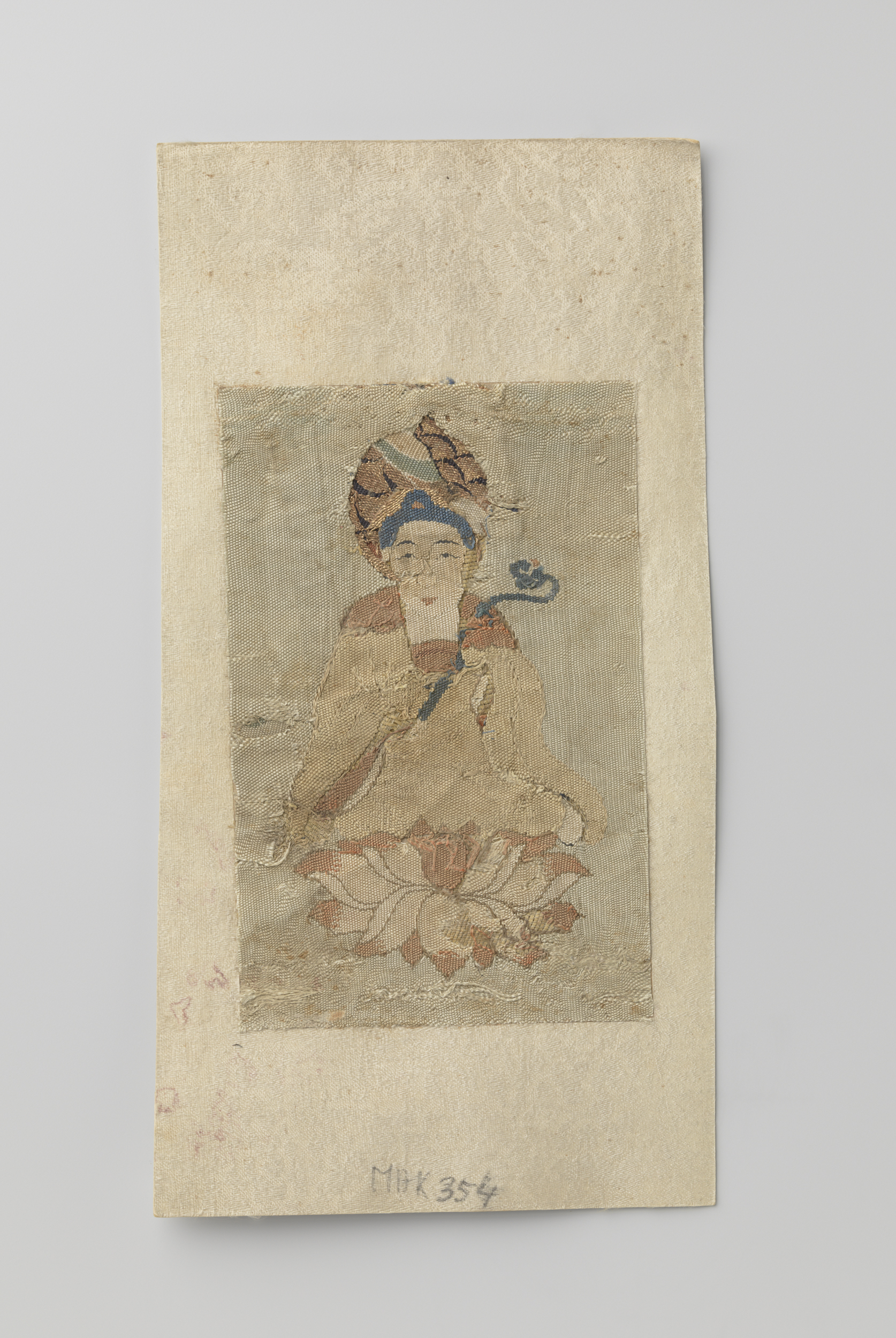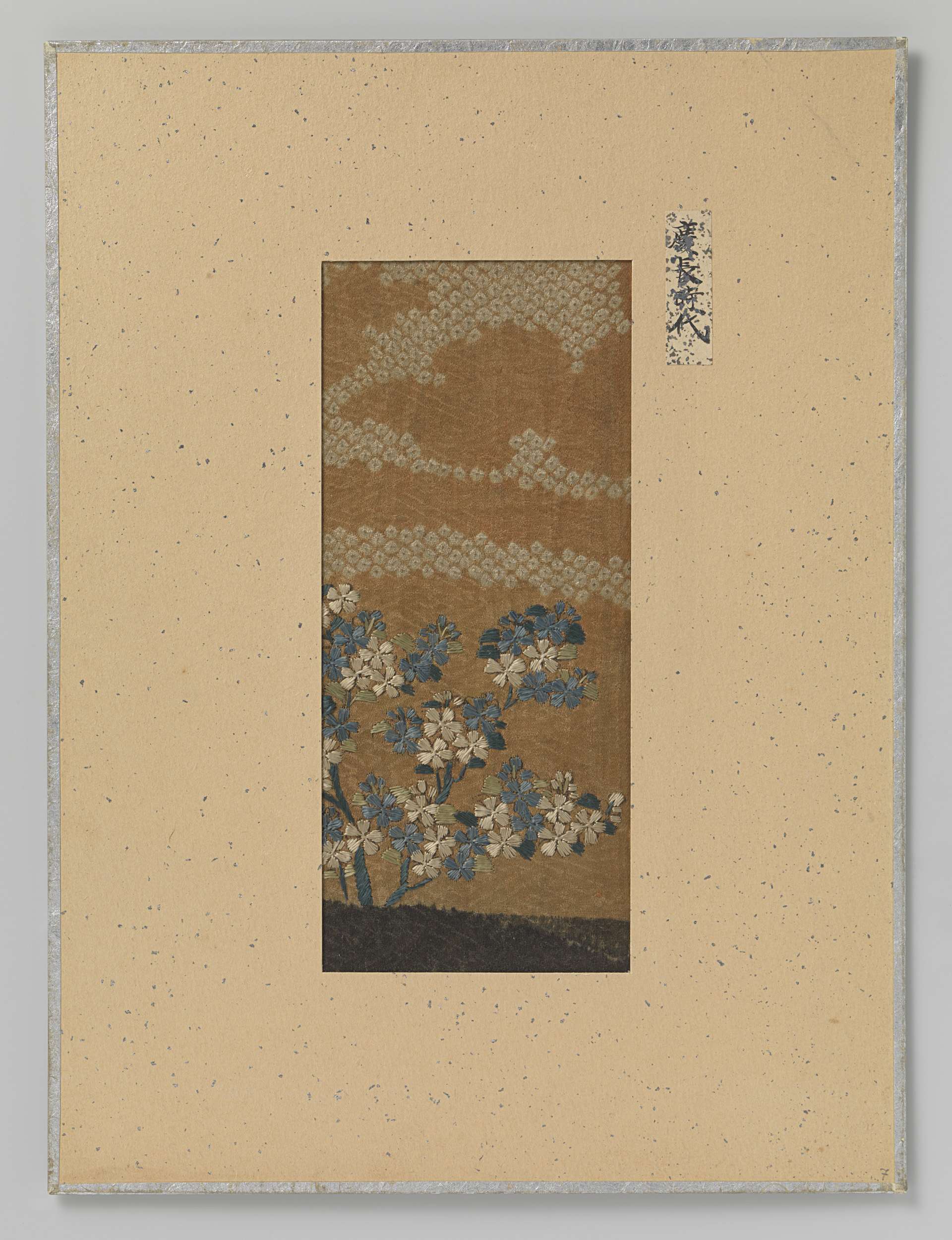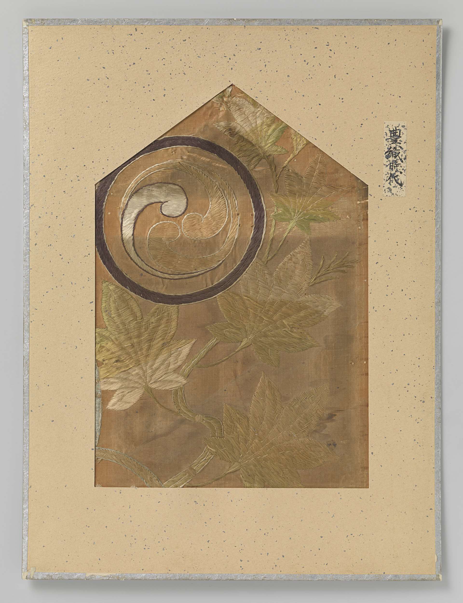 Vier textielfragmenten op een blad, borduursel op zijde