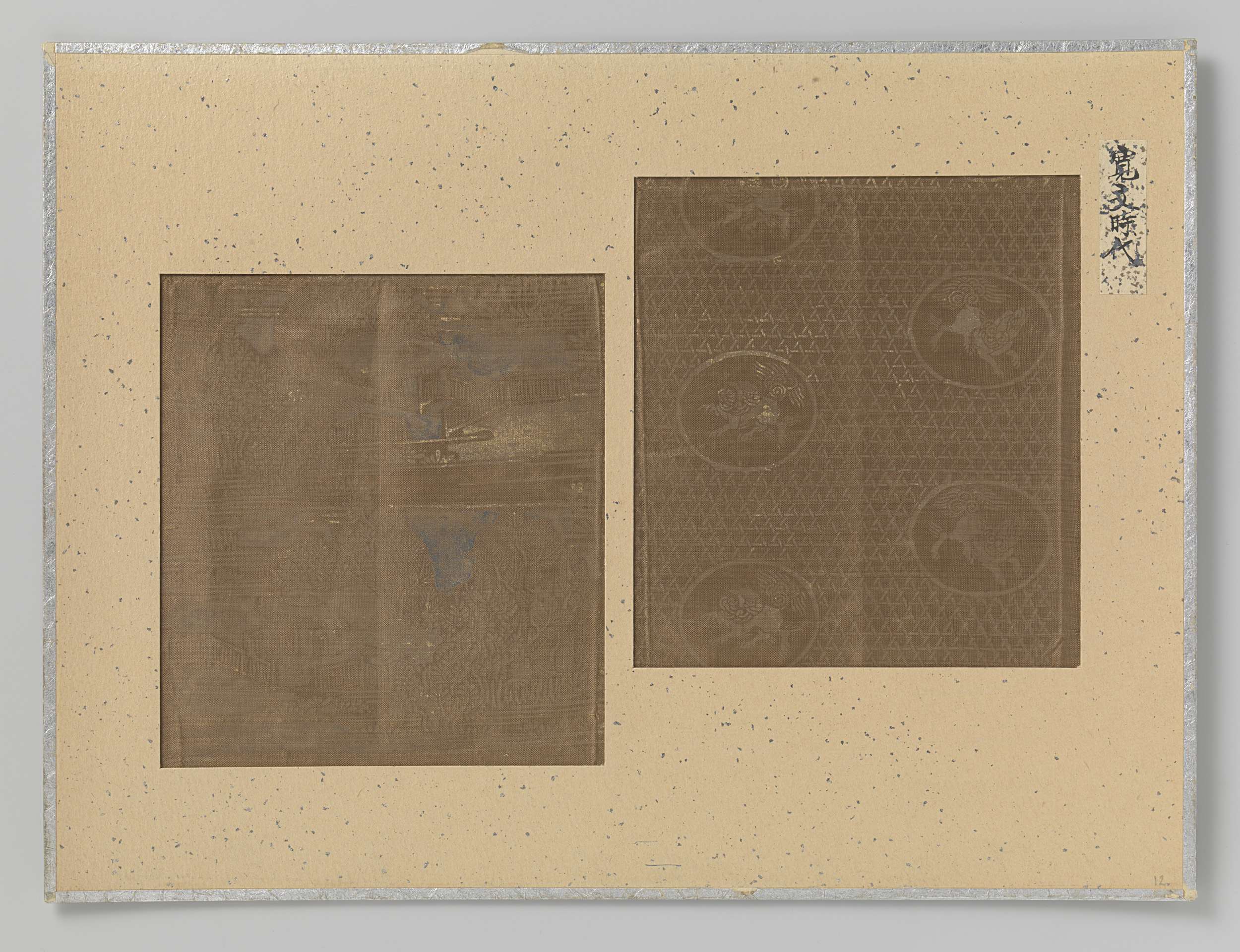 Twee textielfragmenten op een blad, borduursel en dr...