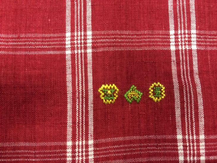 Naailap van van wit linnen, benaaid met rood katoen,...