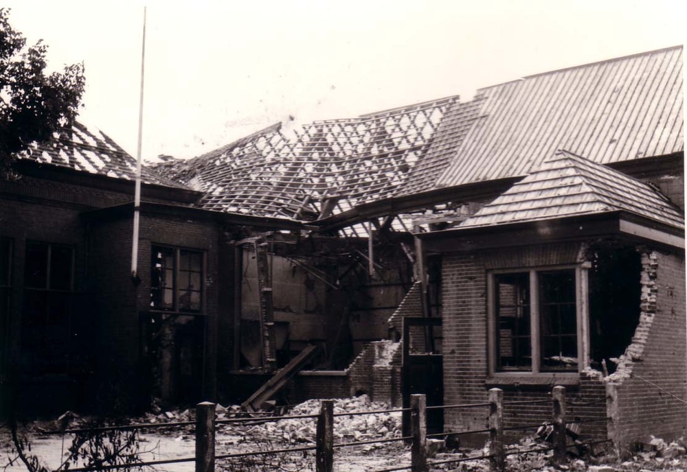 Gebombardeerde school in de Voorstraat in Ammerzoden.