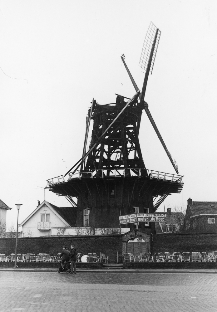 Strandboulevard met uitgebrande molen De Hoop