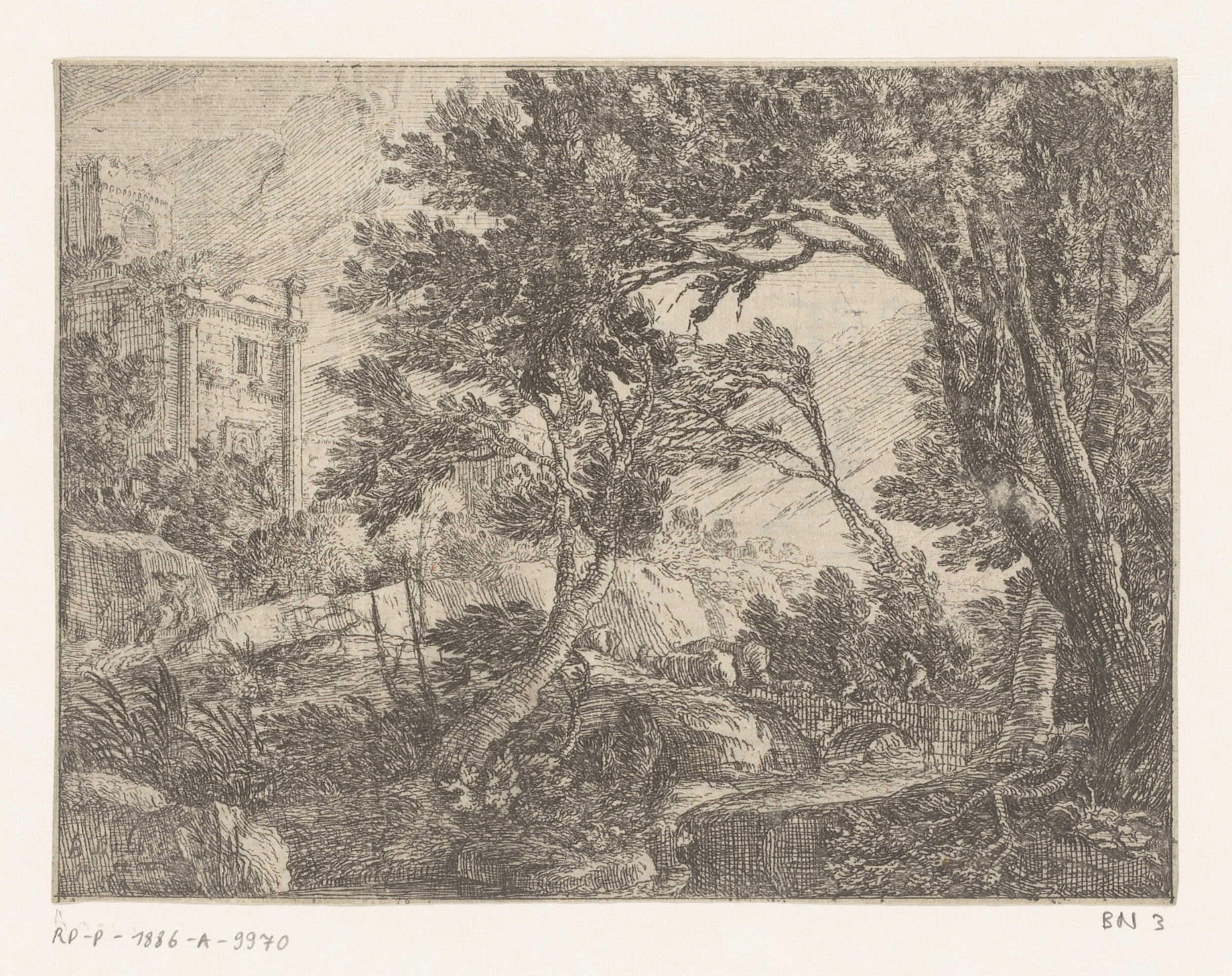 Landschap met een vrouw en een jongetje die takken s...