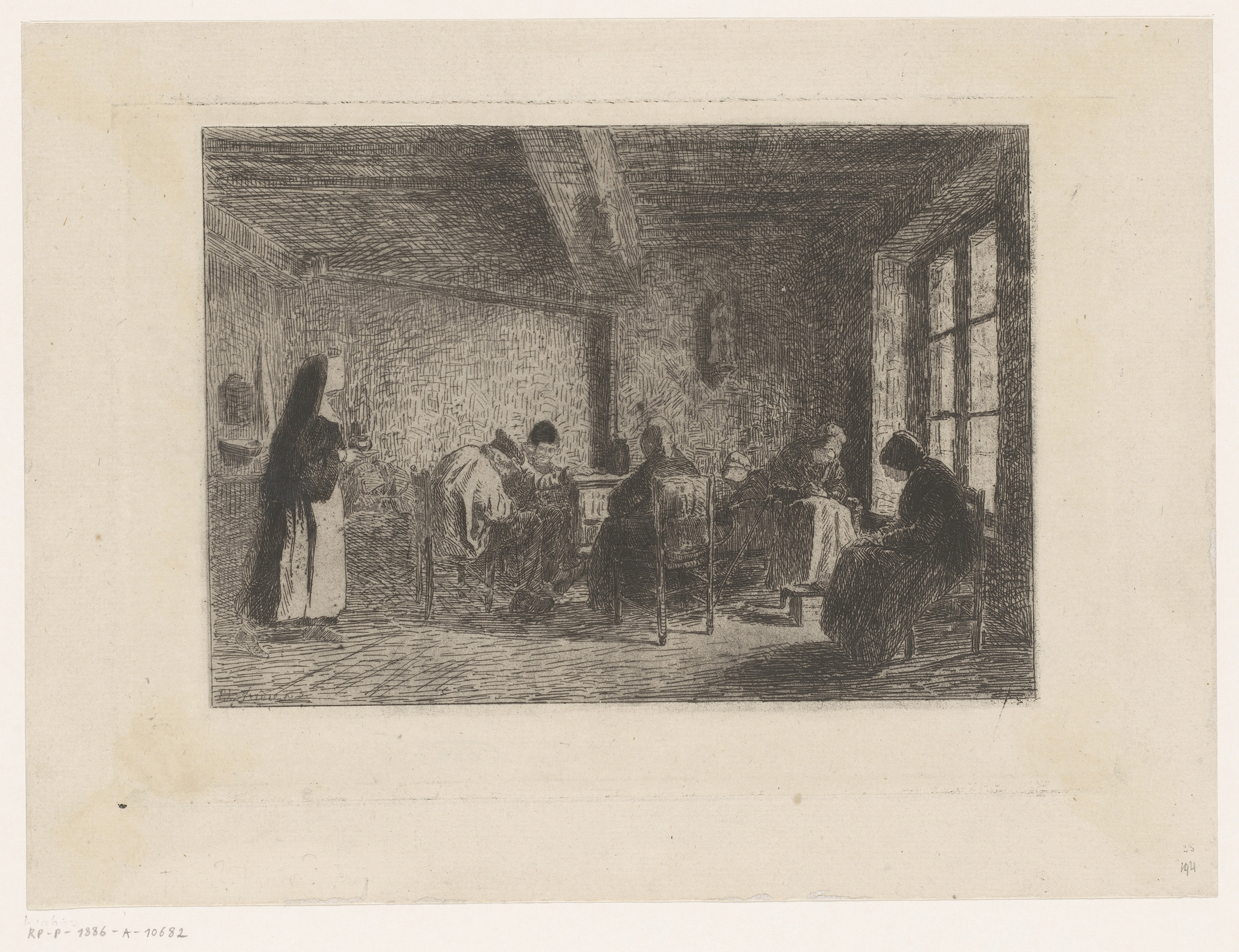 Kamer met oude mensen, onder toezicht van een non