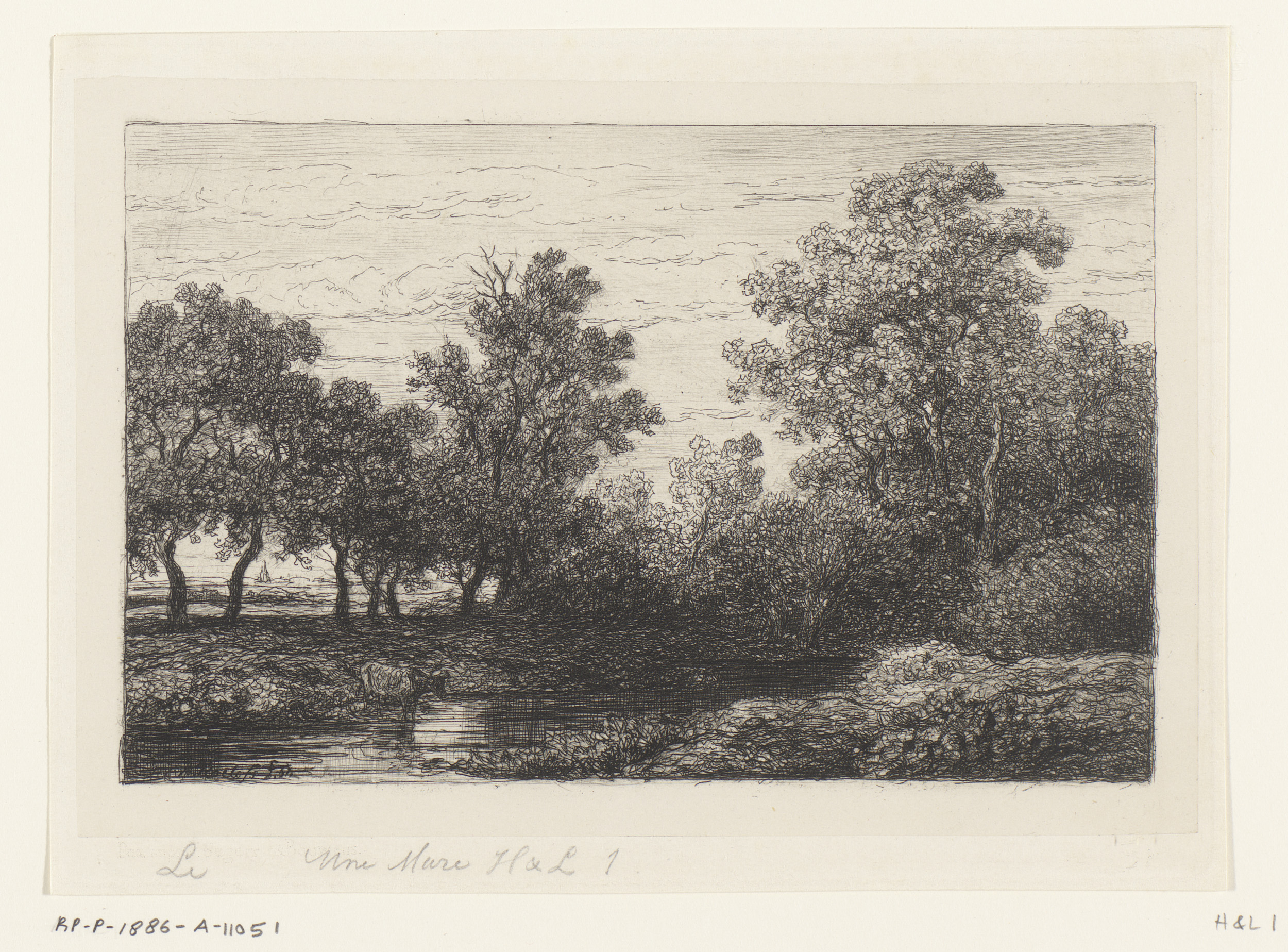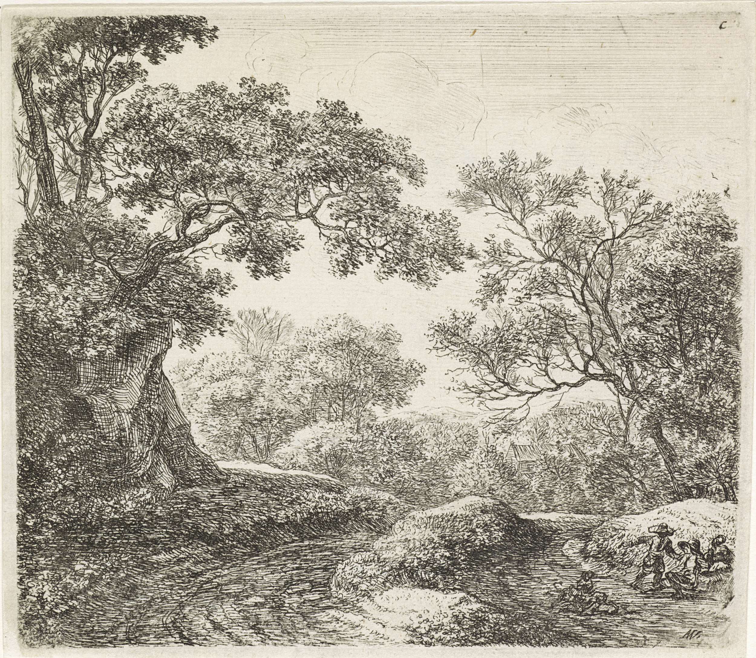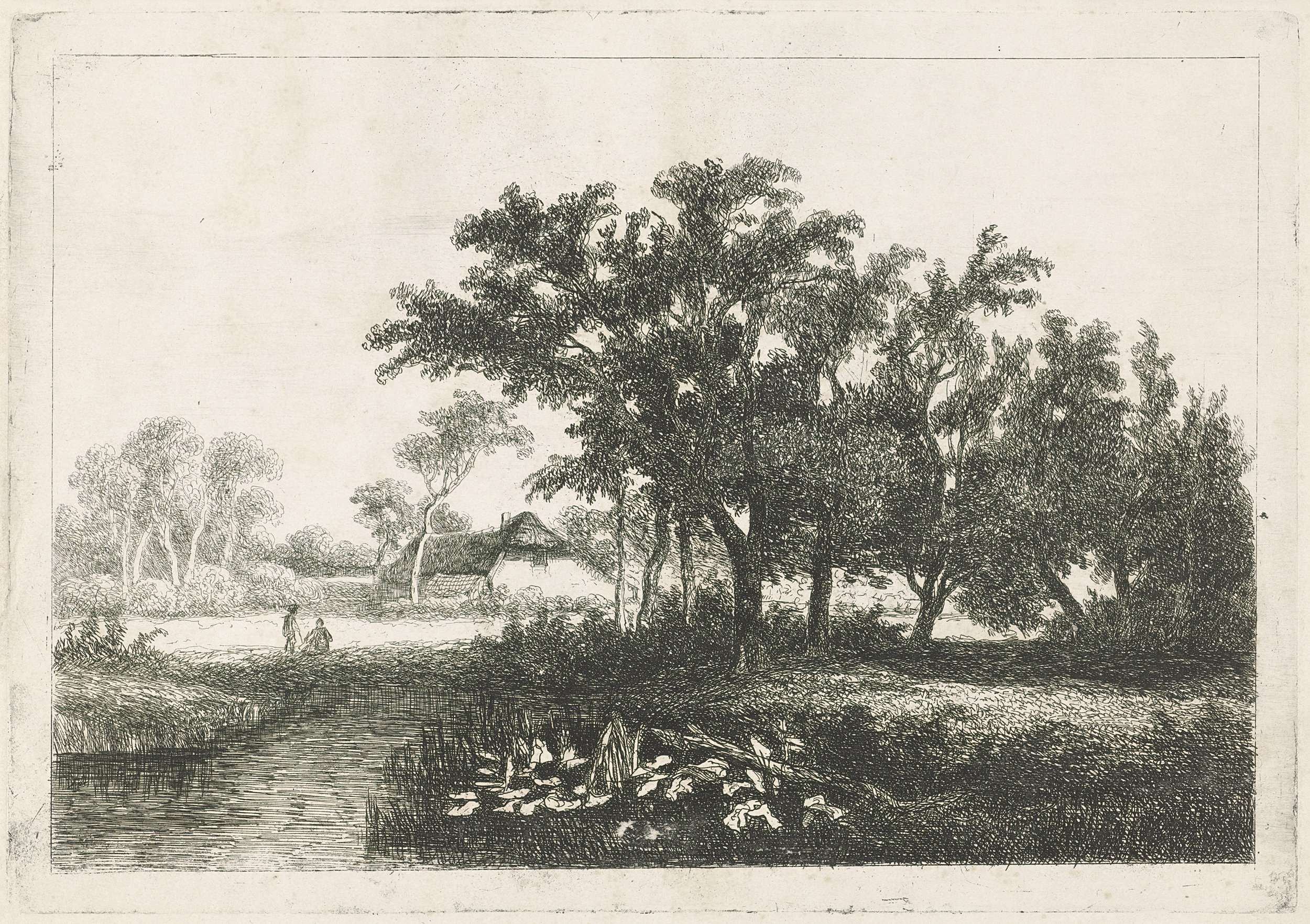 Rivierlandschap met bomen, in de verte twee ruiters