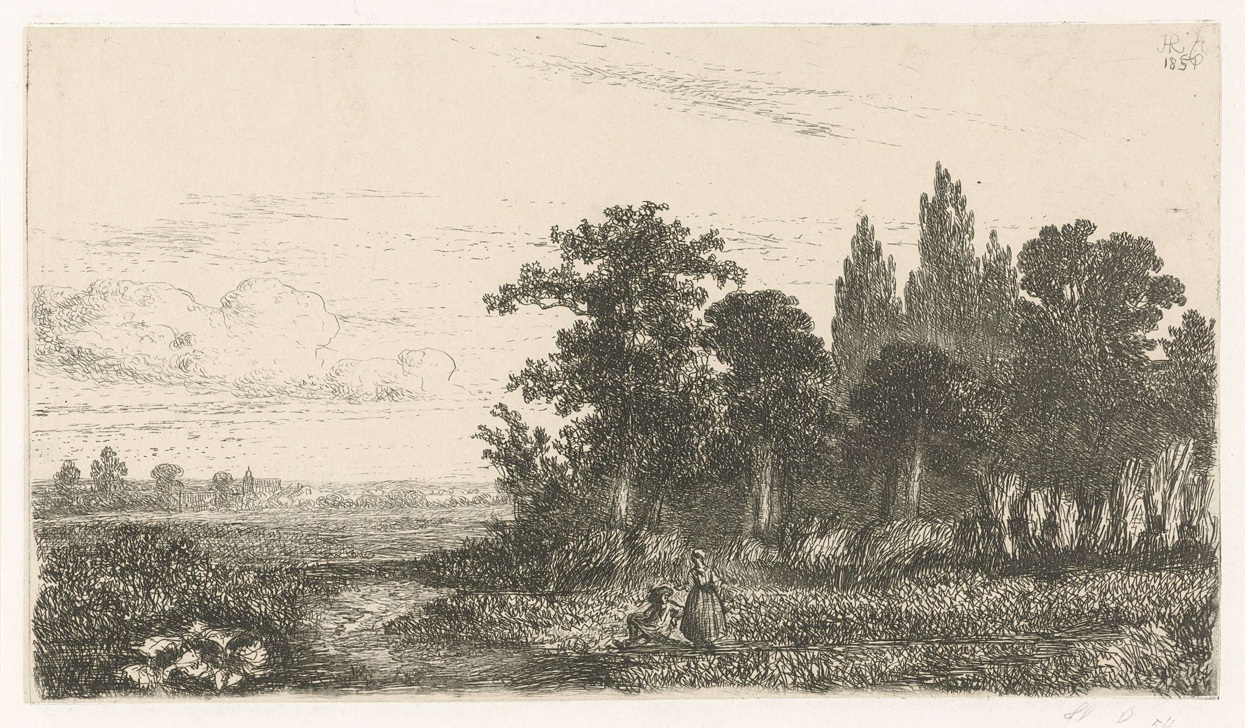 Twee figuren bij een smalle rivier