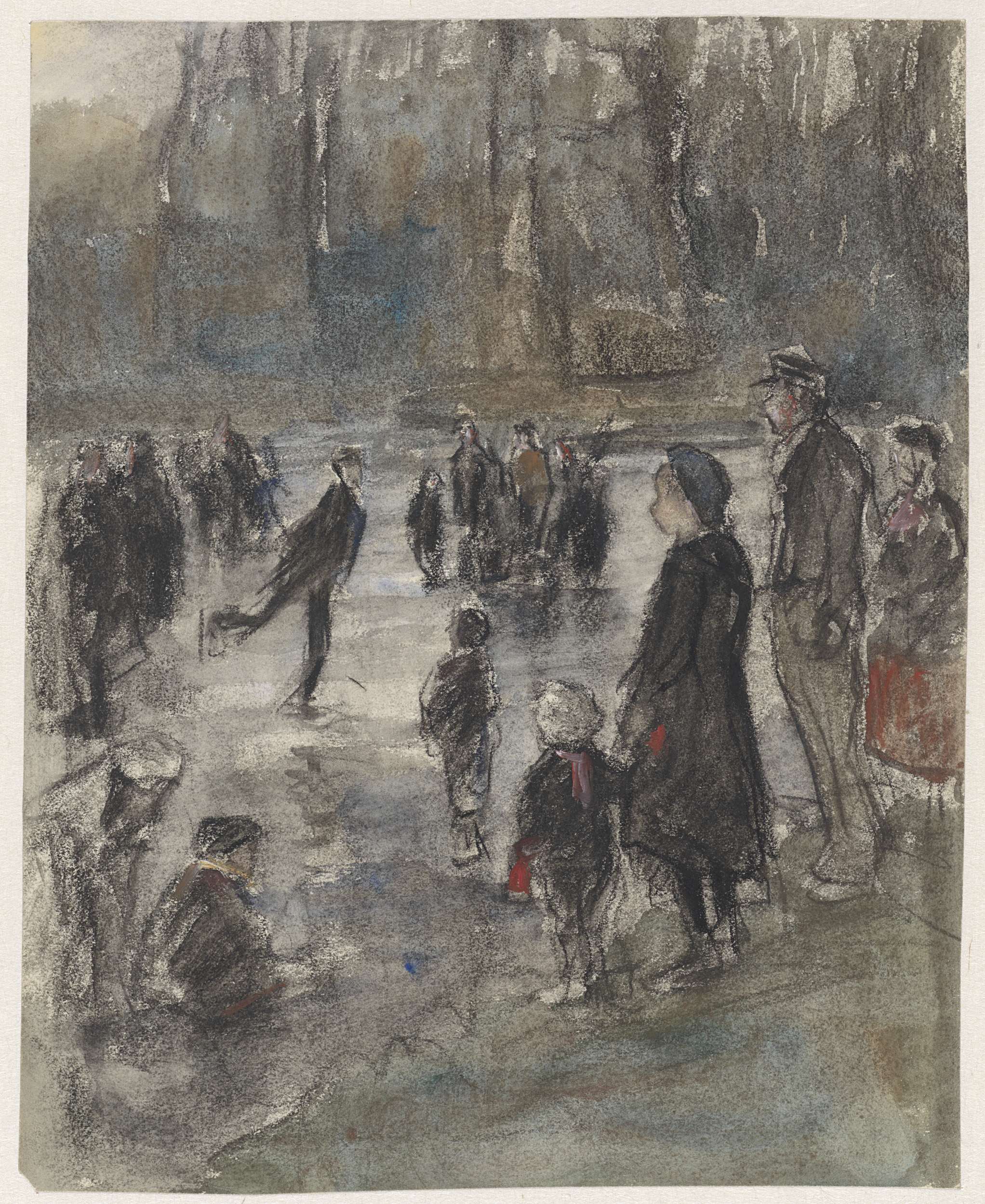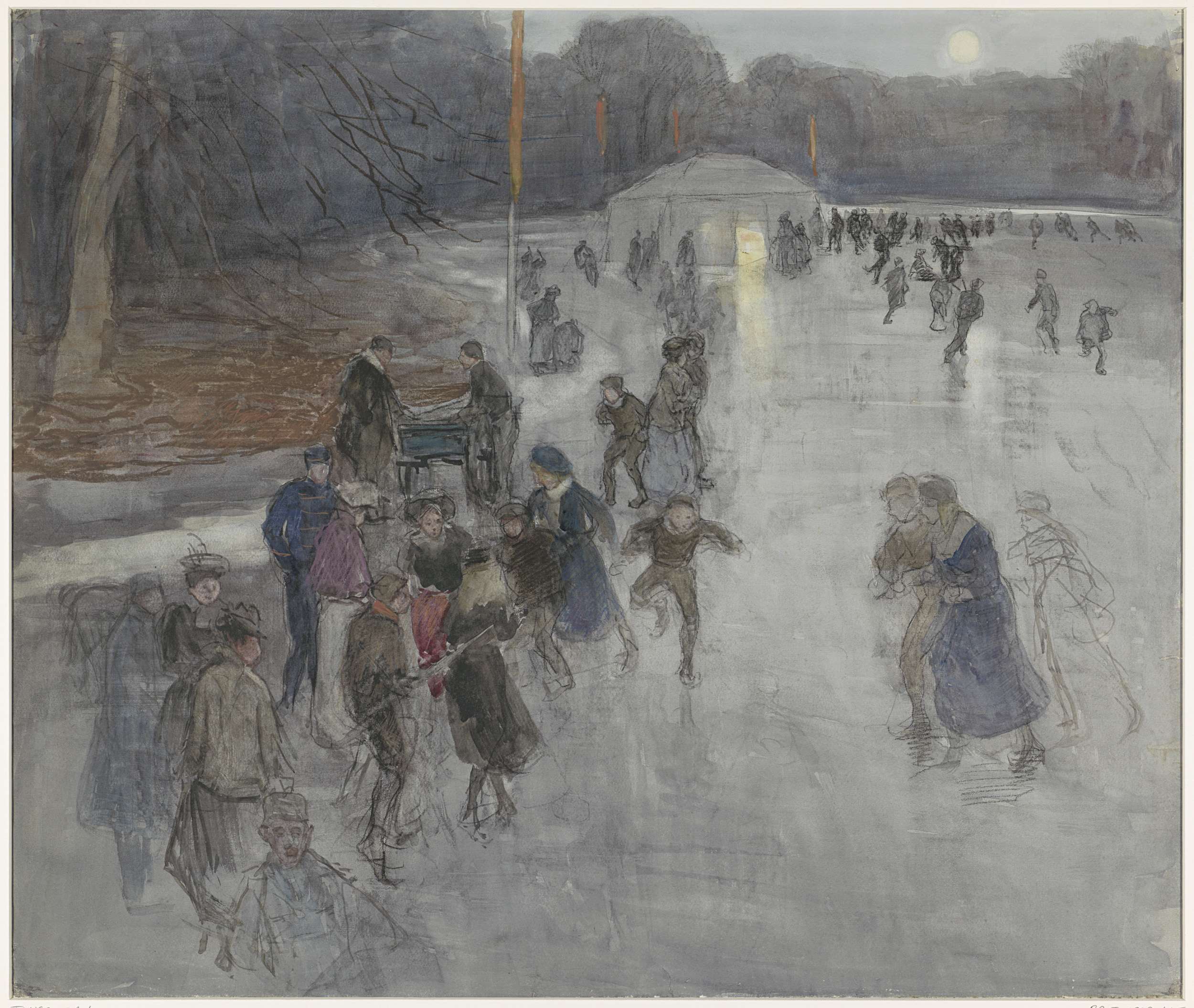 IJsvermaak bij maanlicht, op een bevroren vijver in ...