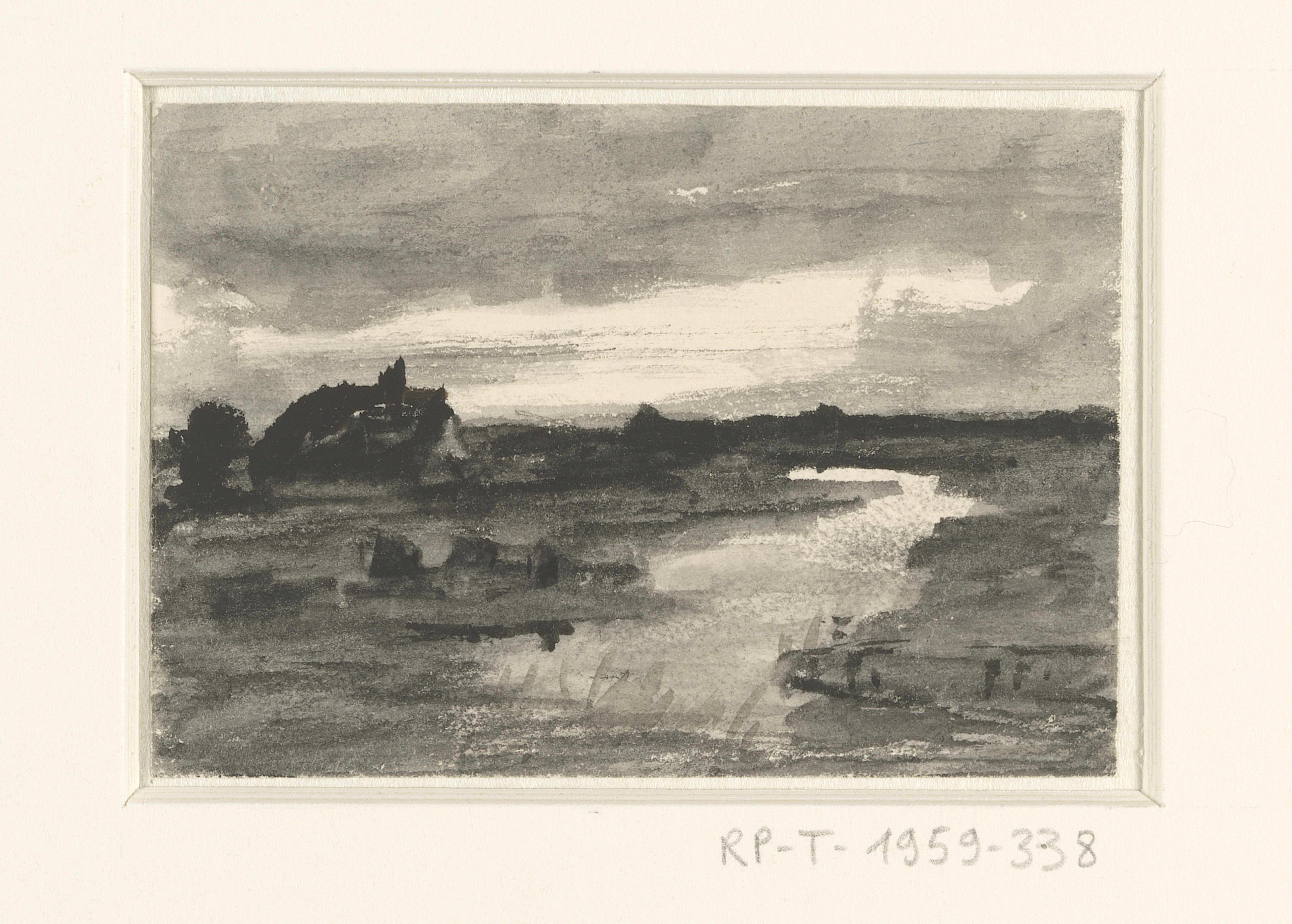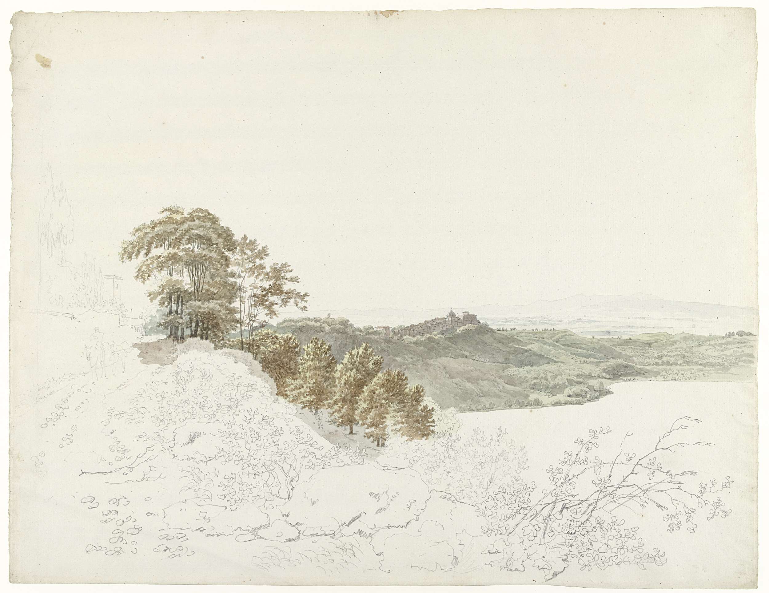 Gezicht op Castel Gandolfo vanaf de oever van het meer