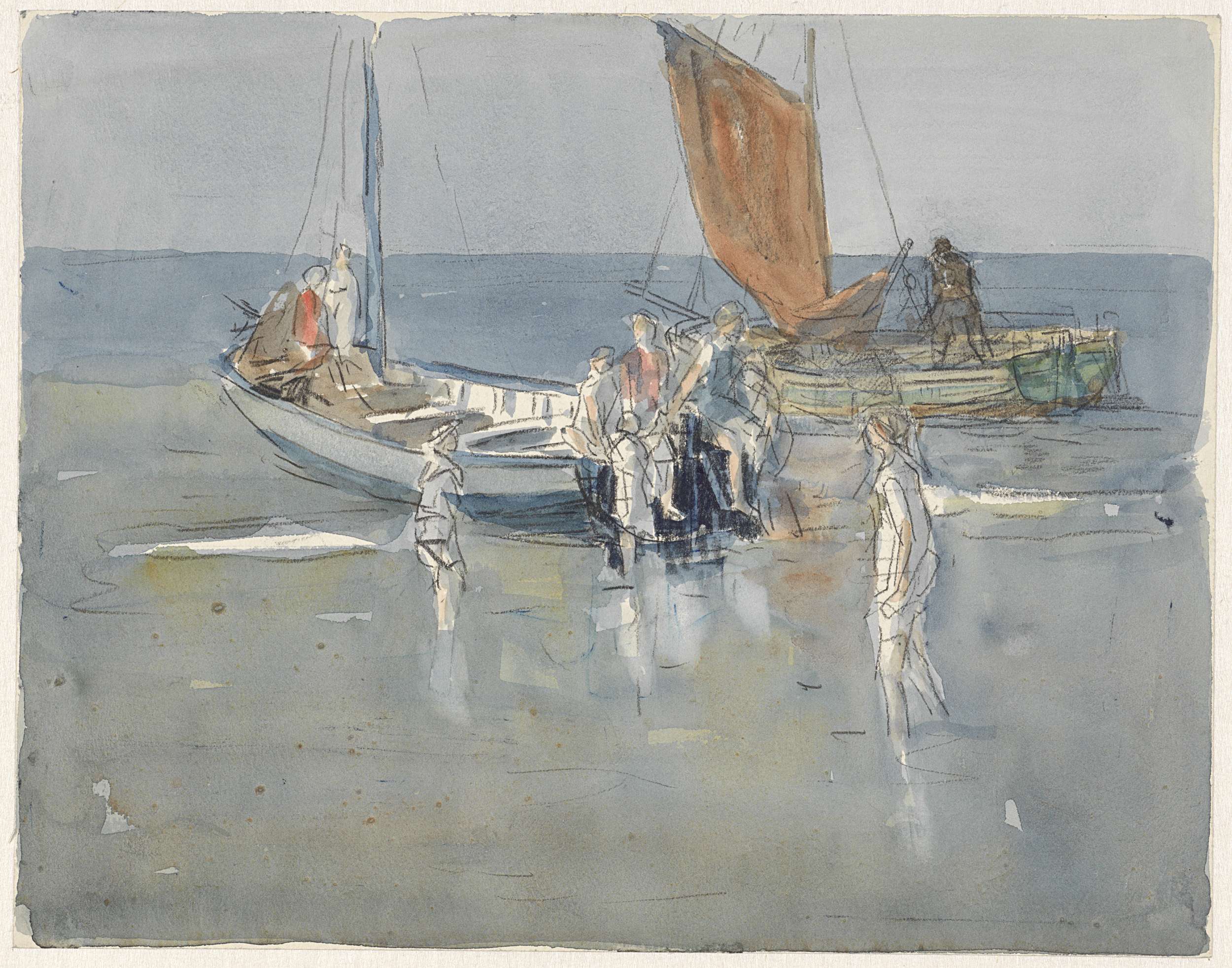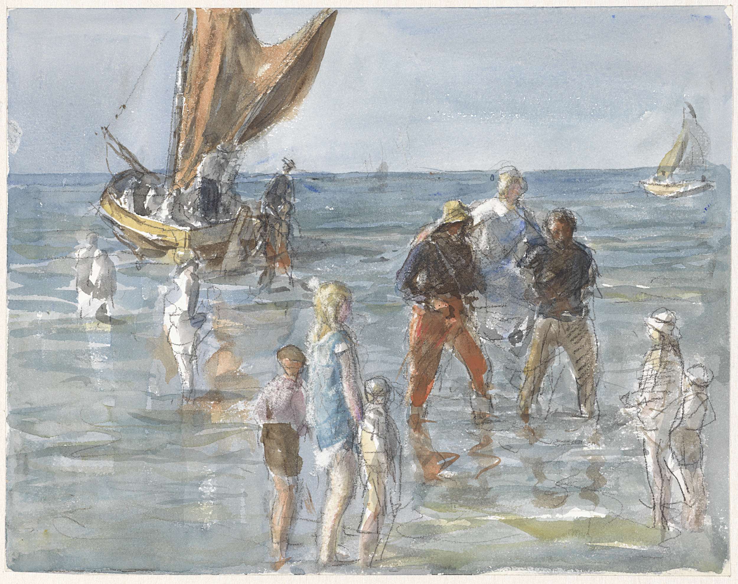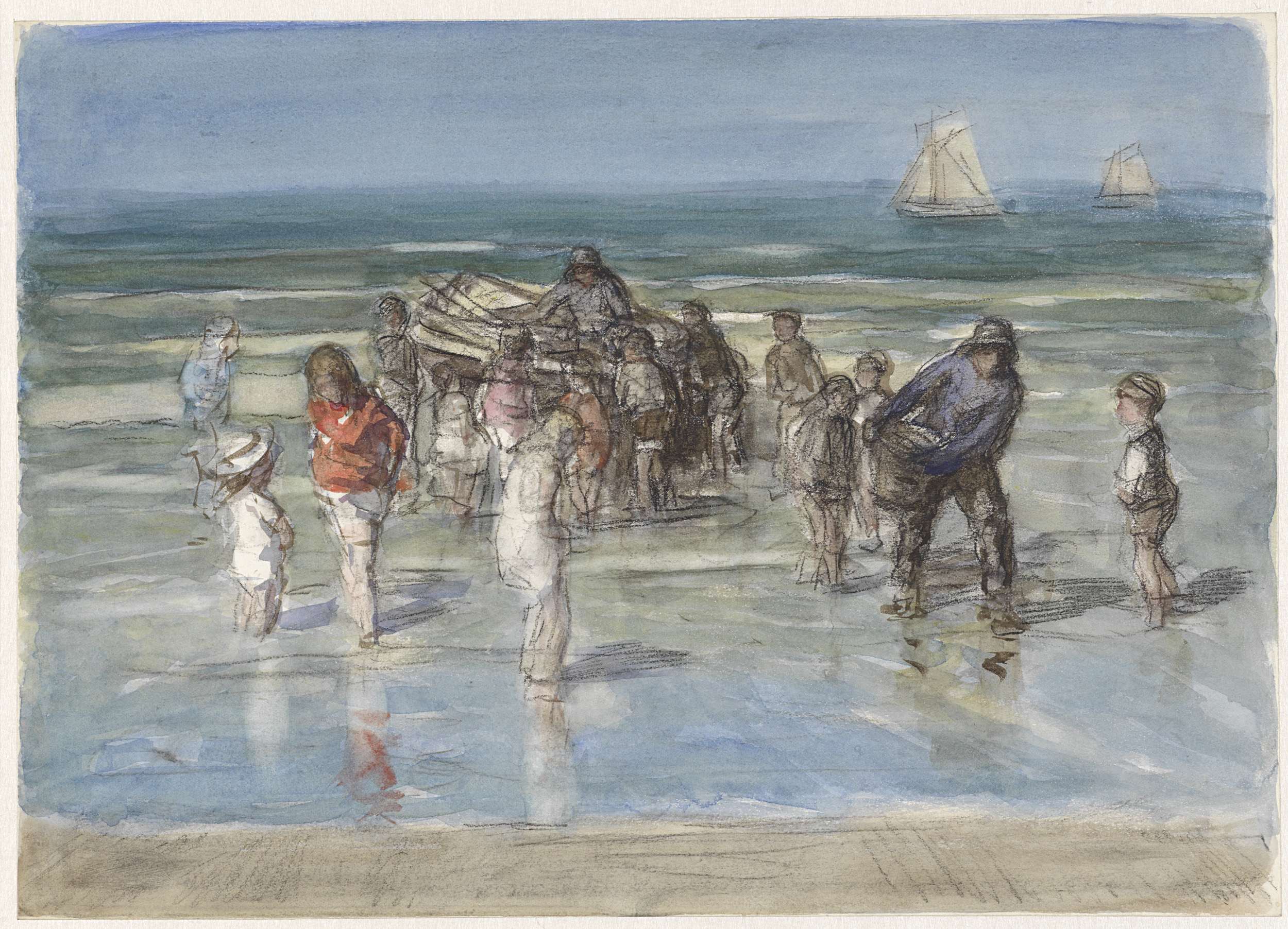Vissersschuit, omgeven door kinderen, op het strand ...