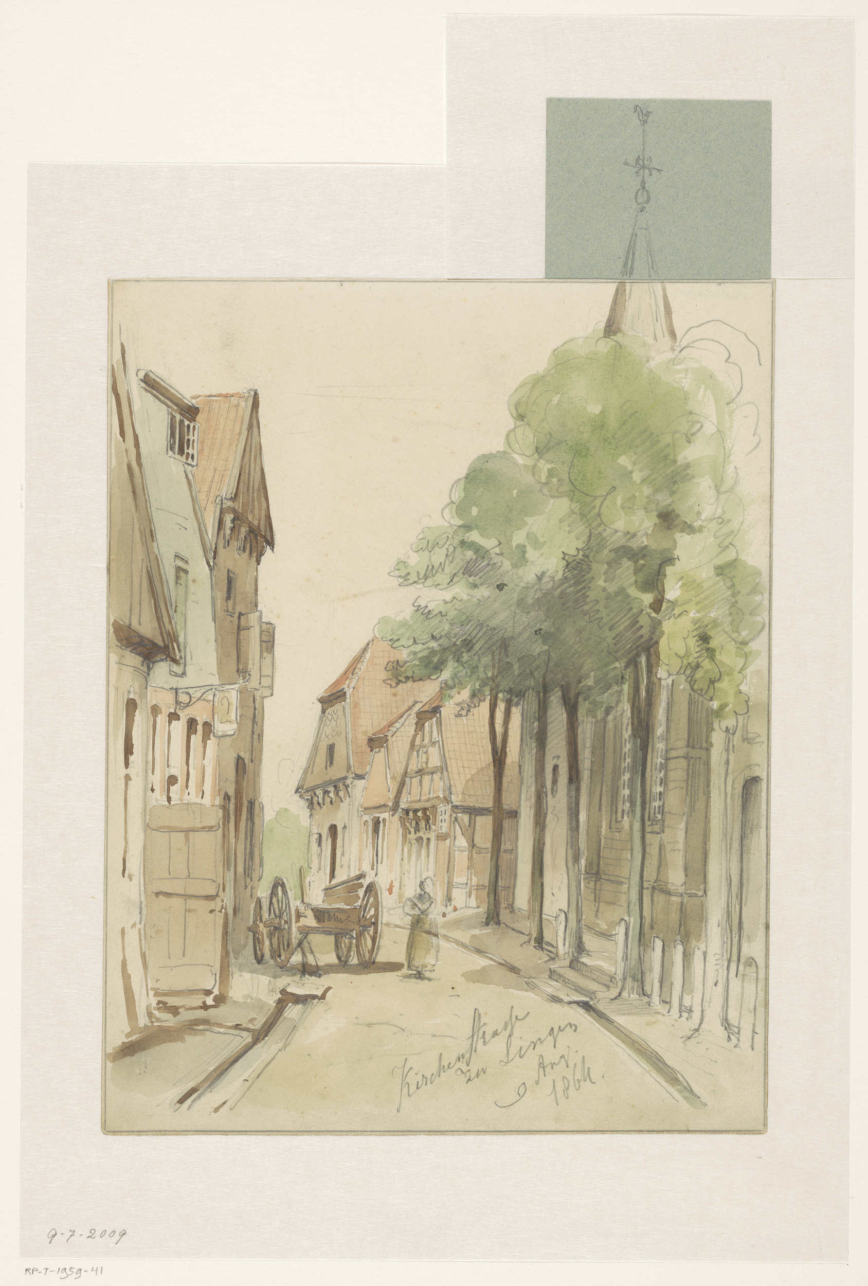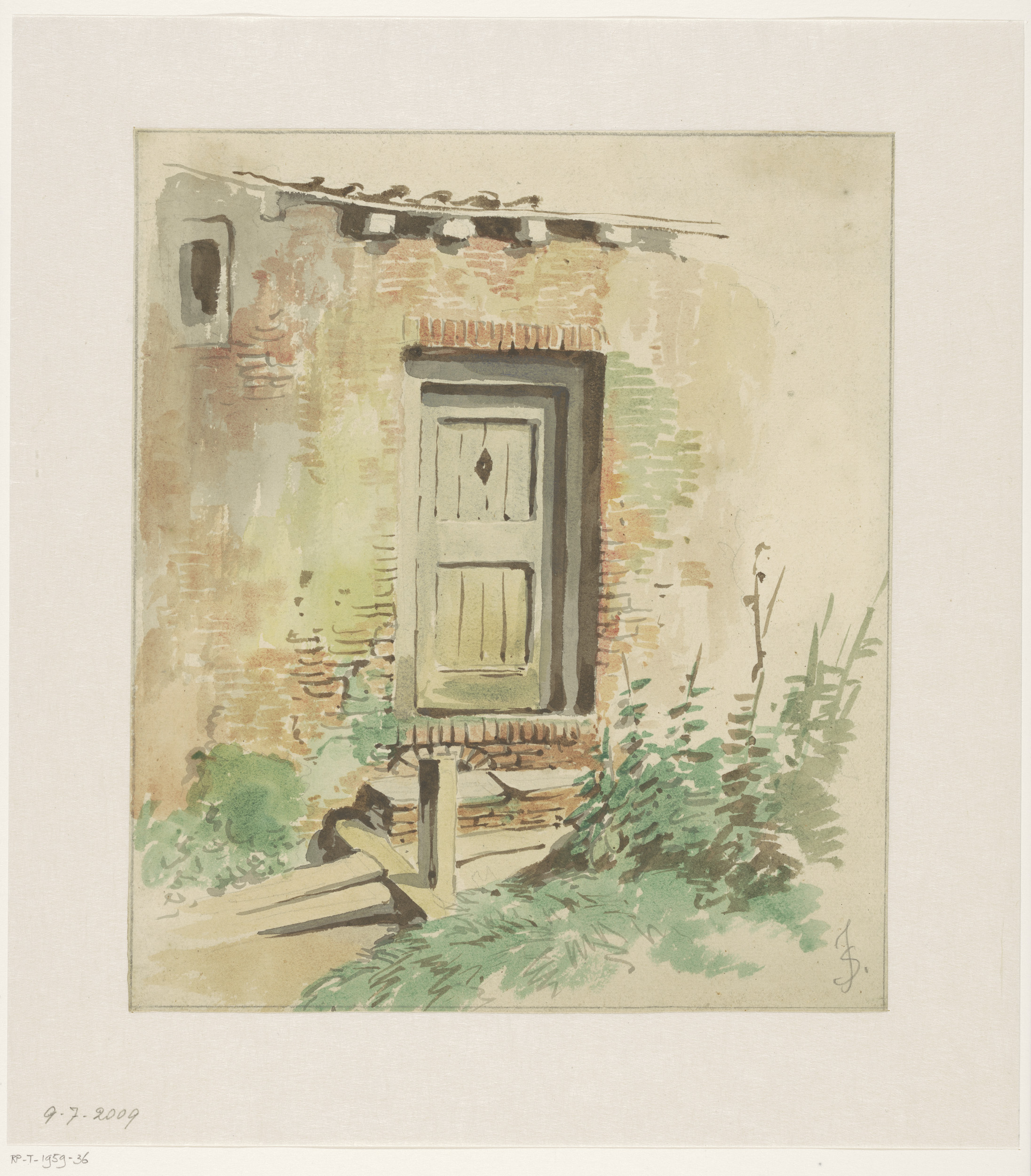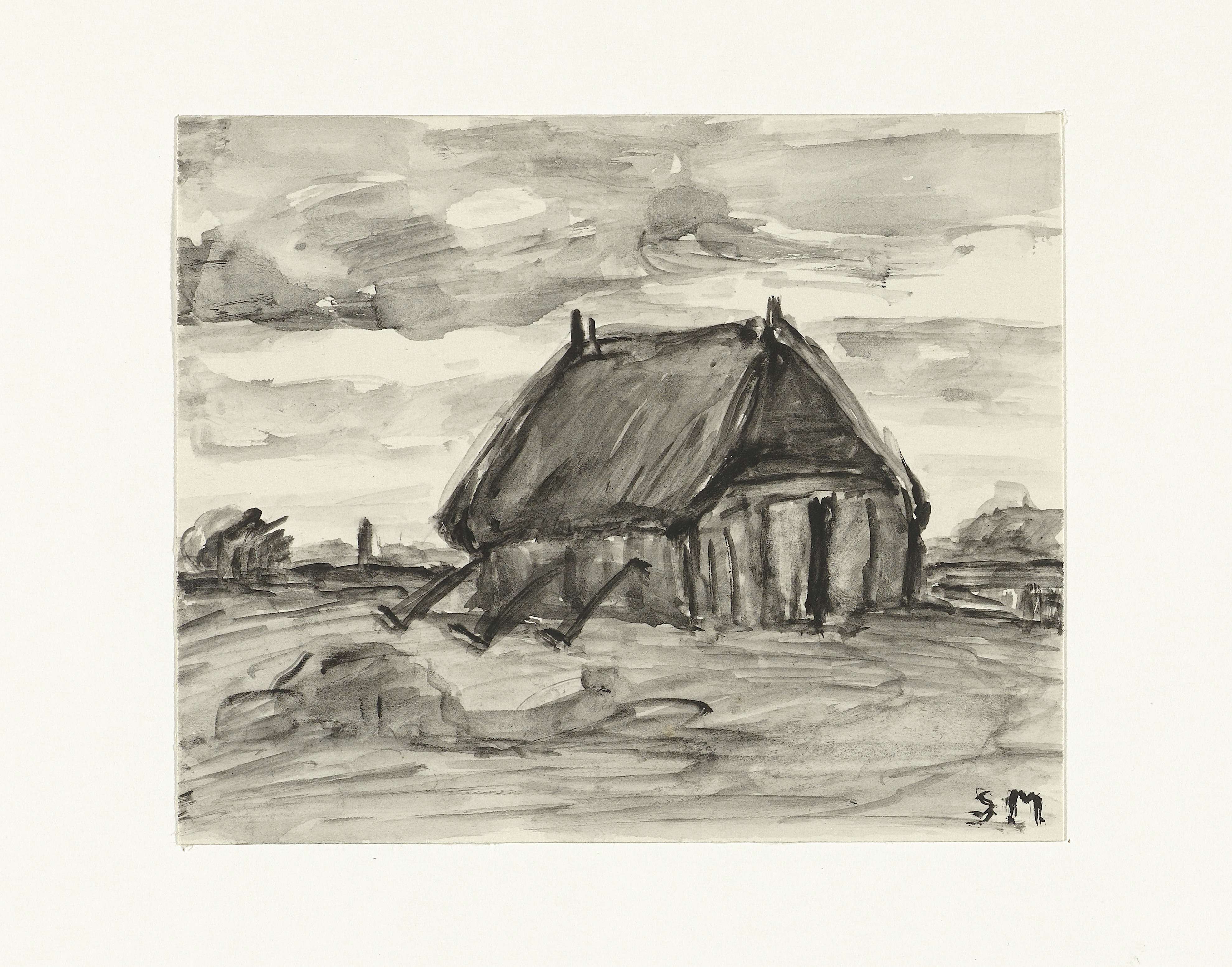 Boerenhuis met houten aanbouw, ervoor een kruiwagen ...