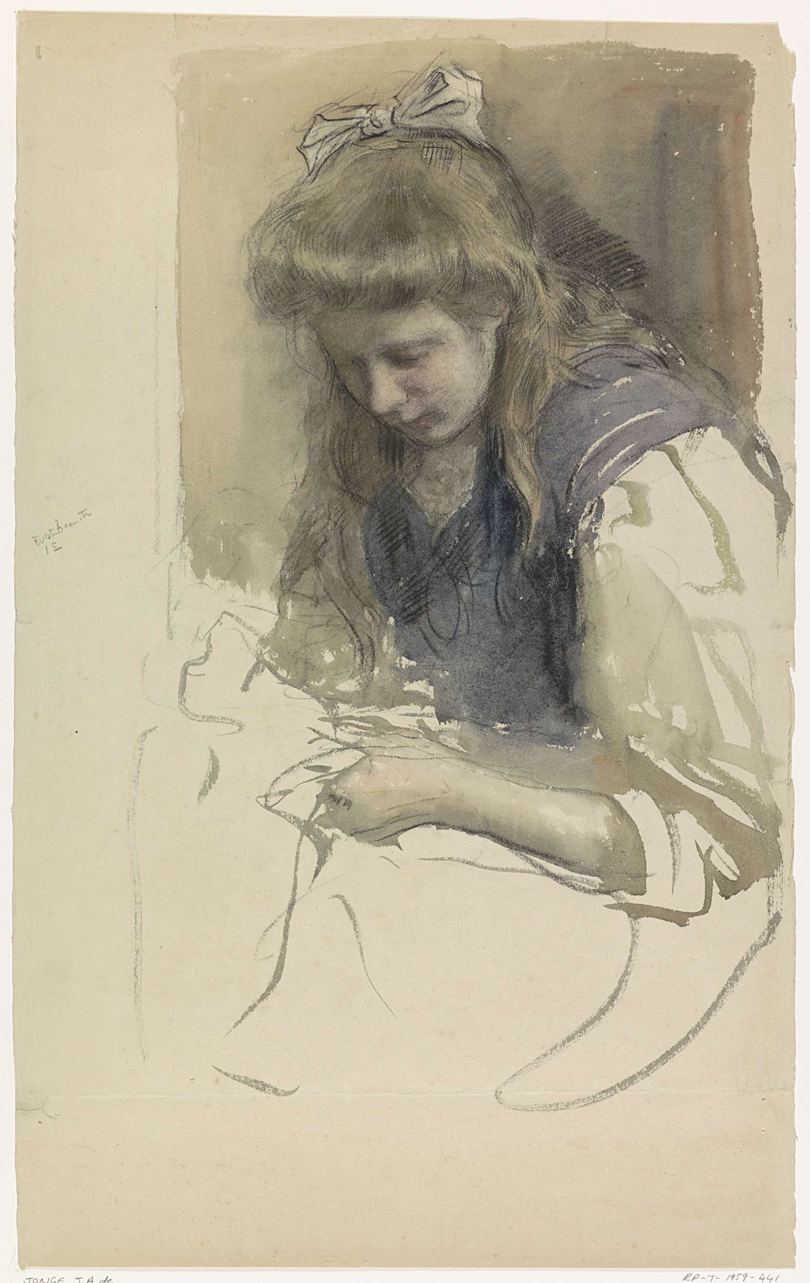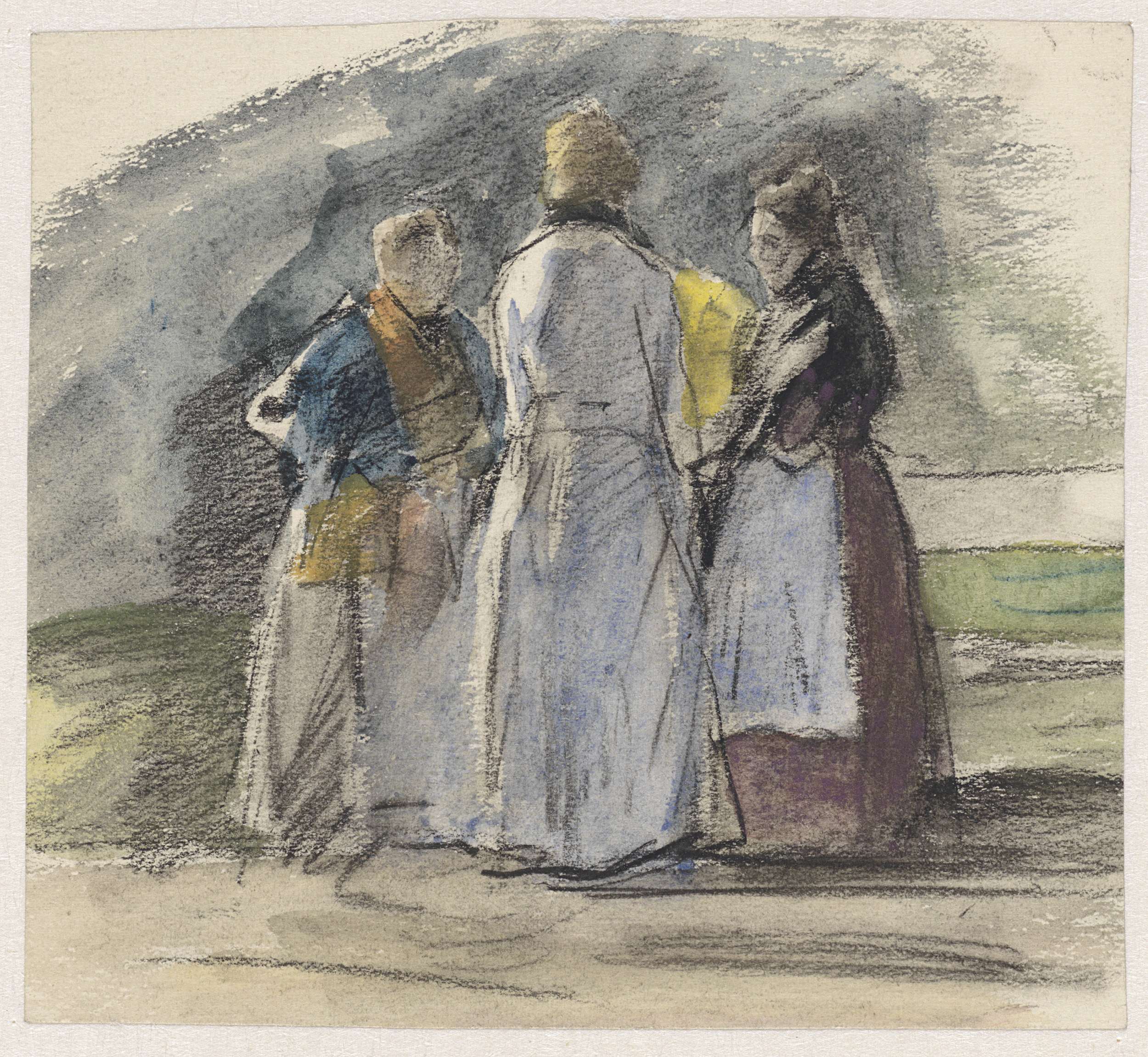 Twee dienstmeisjes, die een mat uitkloppen voor een ...