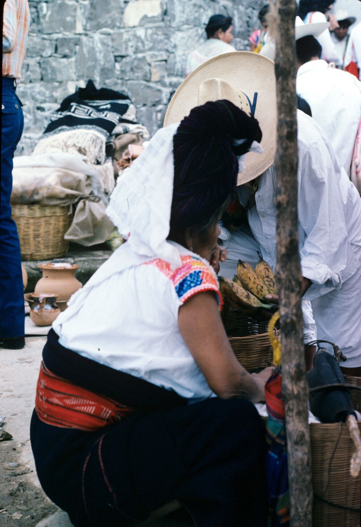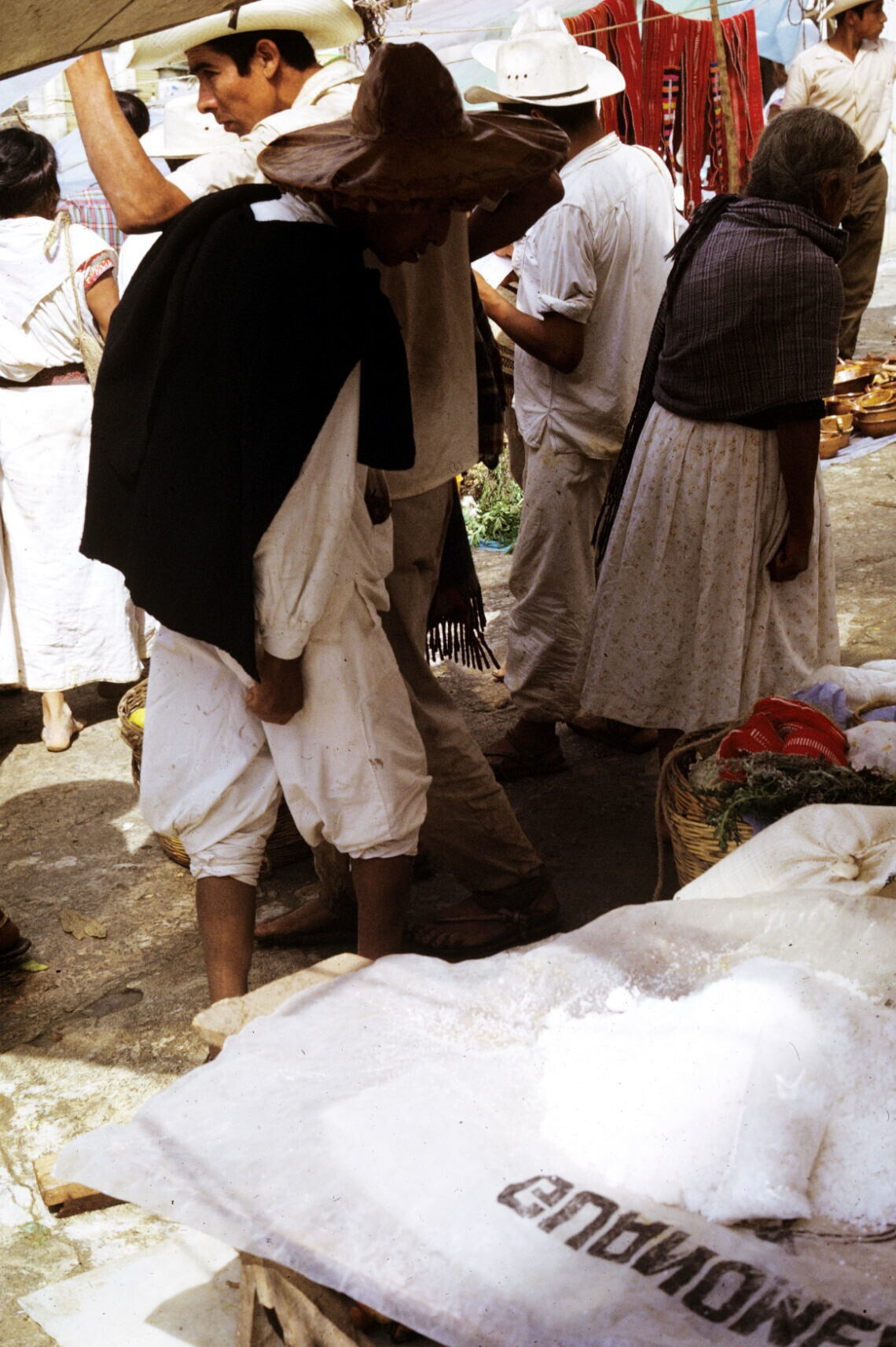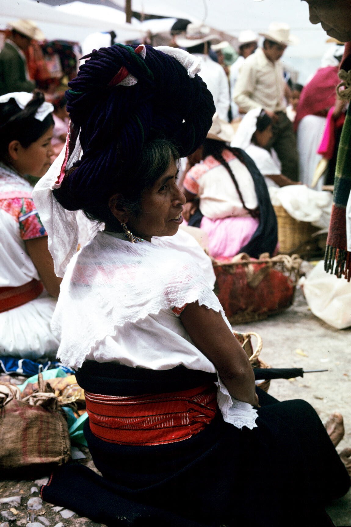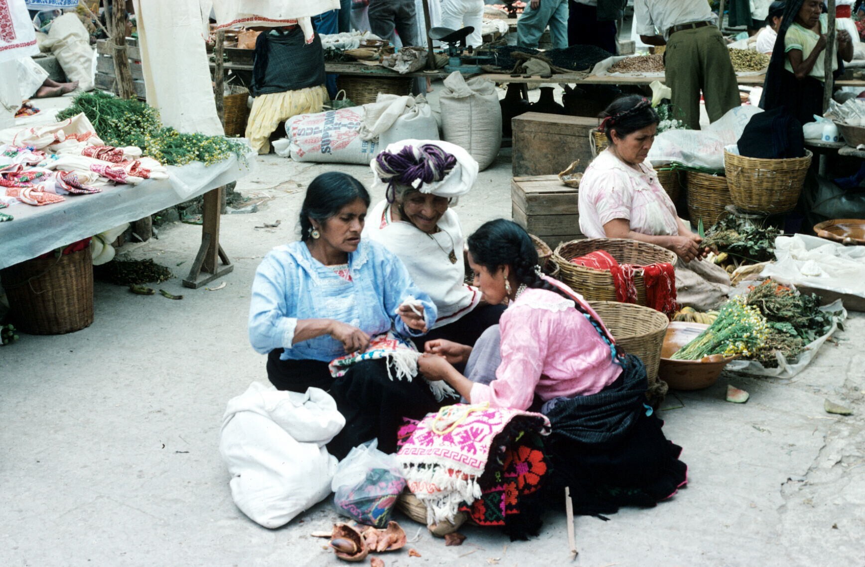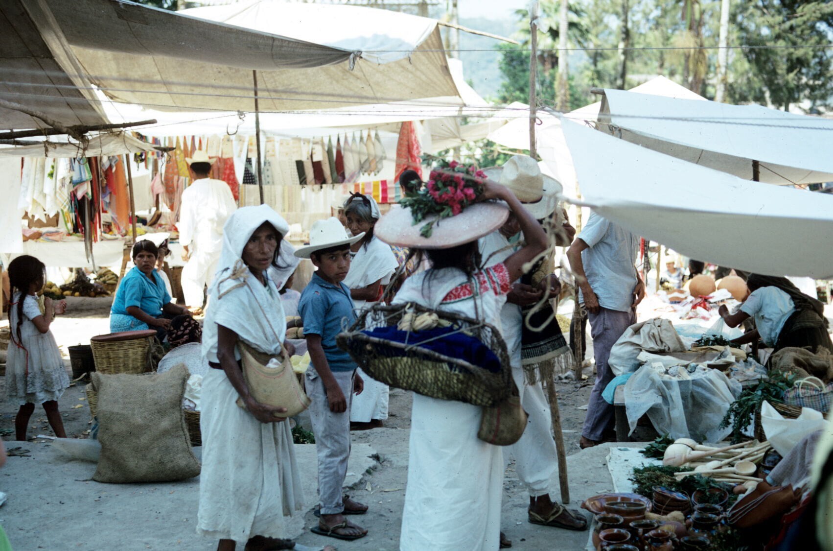 vrouwen op markt; NB vrouw met hua'cal (draagmand)