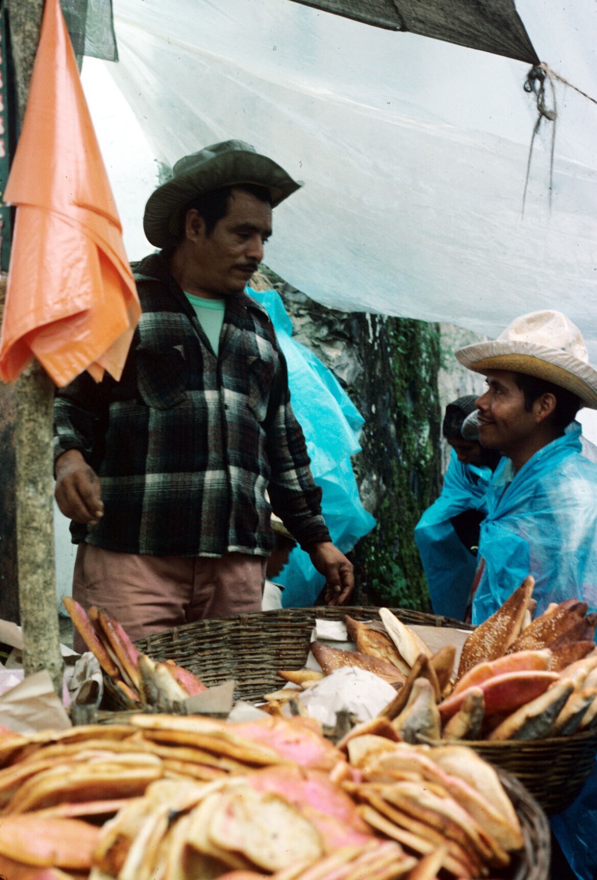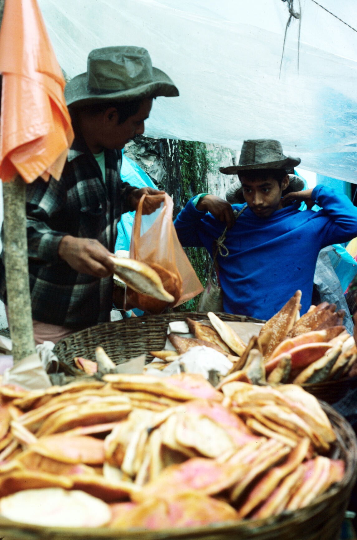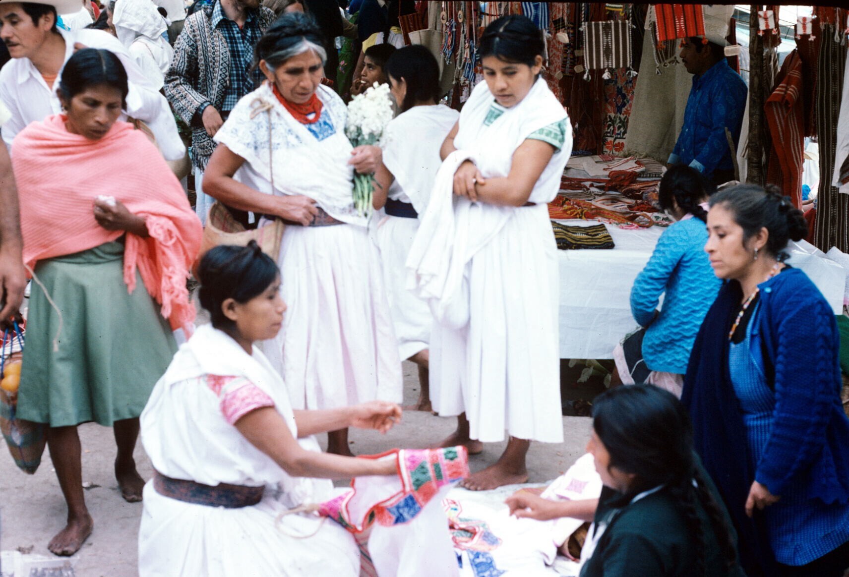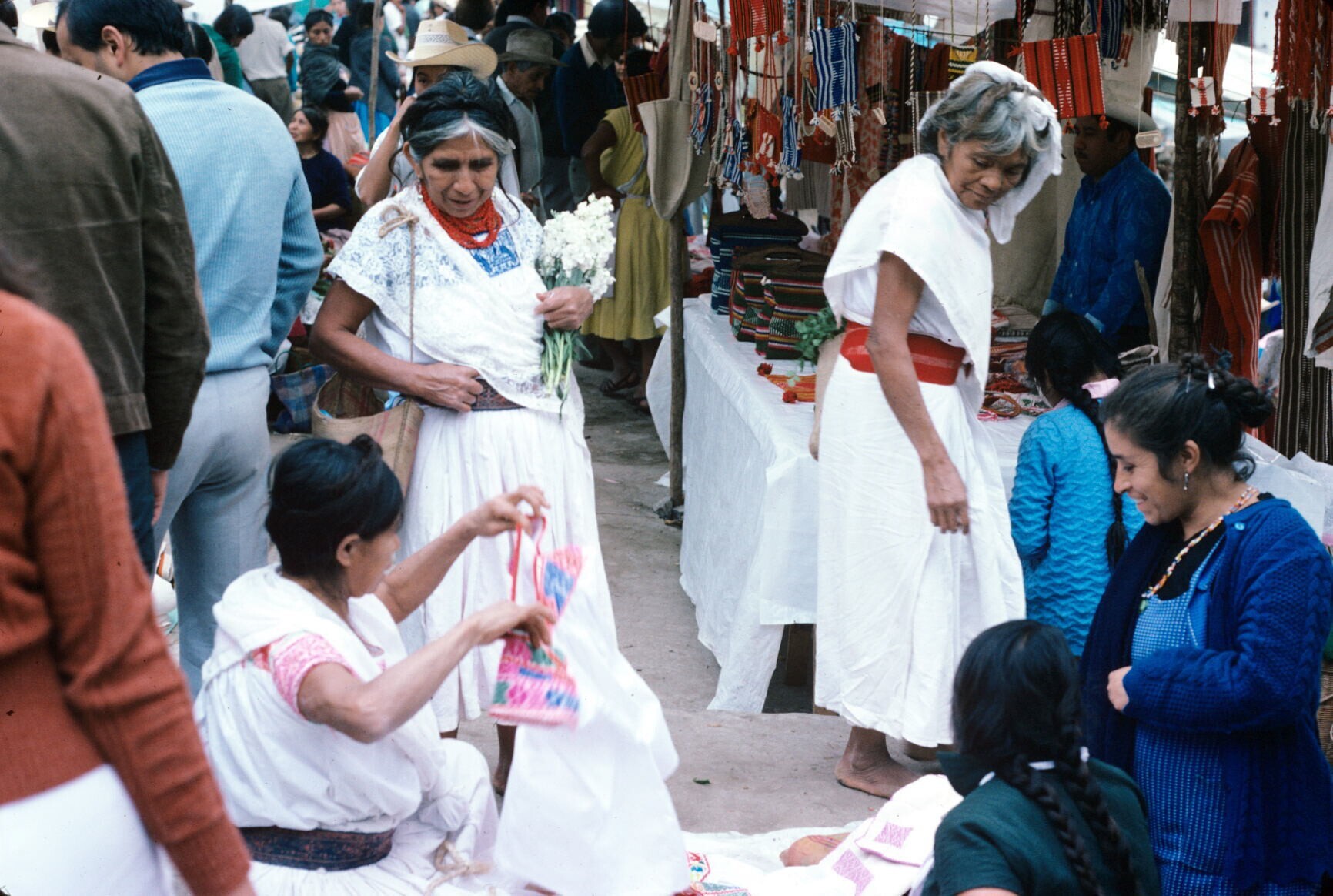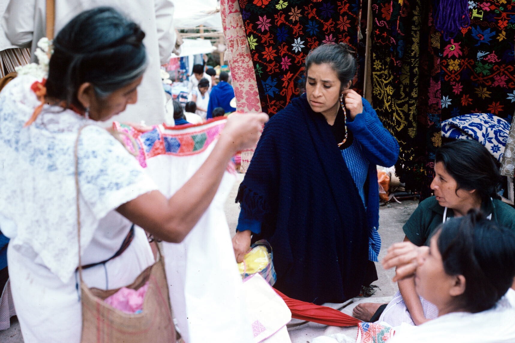 vrouwen op markt; NB vrouw met hua'cal (draagmand)