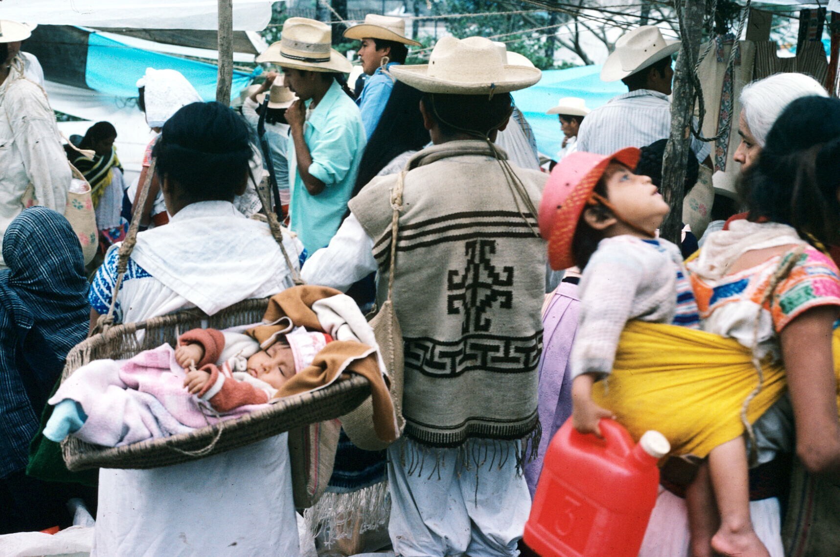 kind in draagdoek en kind in hua'cal (draagmand)