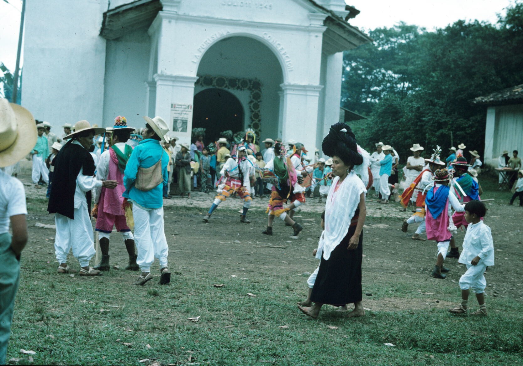 Santiaguero-dans voor kerk; op voorgrond vrouw met m...