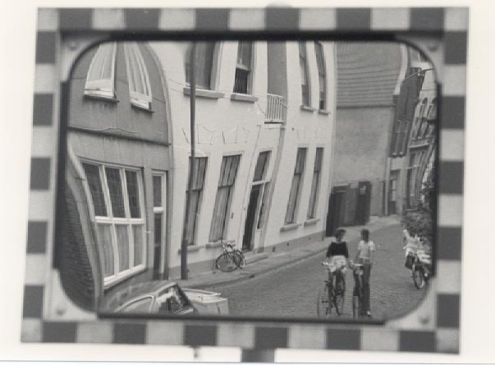 Langwerpige spiegel van glas met tekst ca. 1970-2005