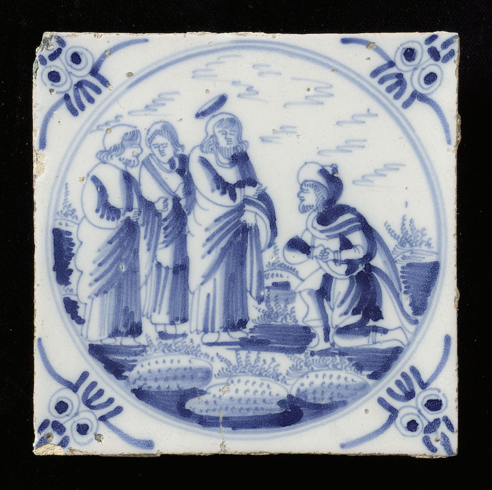 Tegel van keramiek met tinglazuur, voorstellende: De...