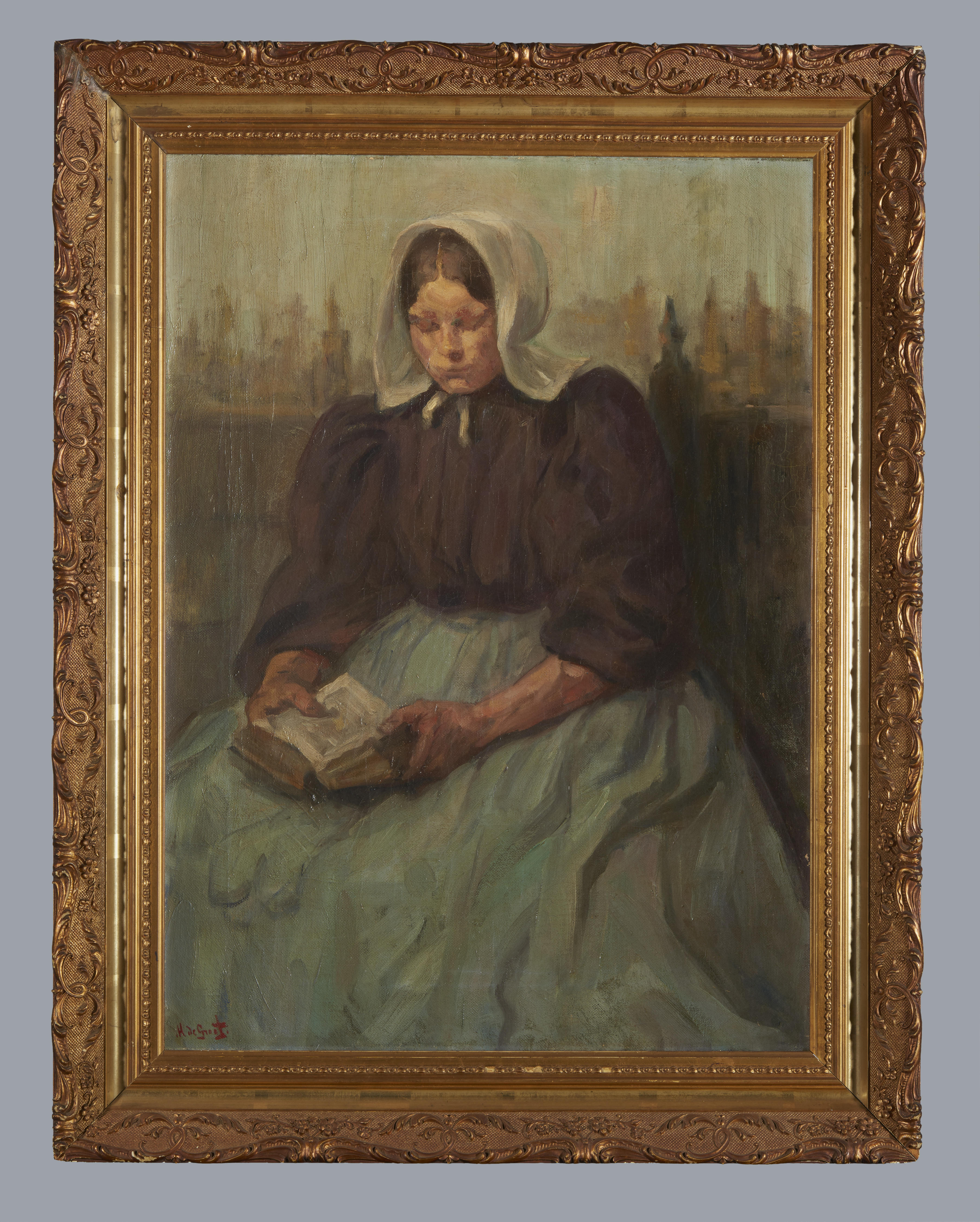Schilderij van lezende vrouw in Huizer streekdracht,...