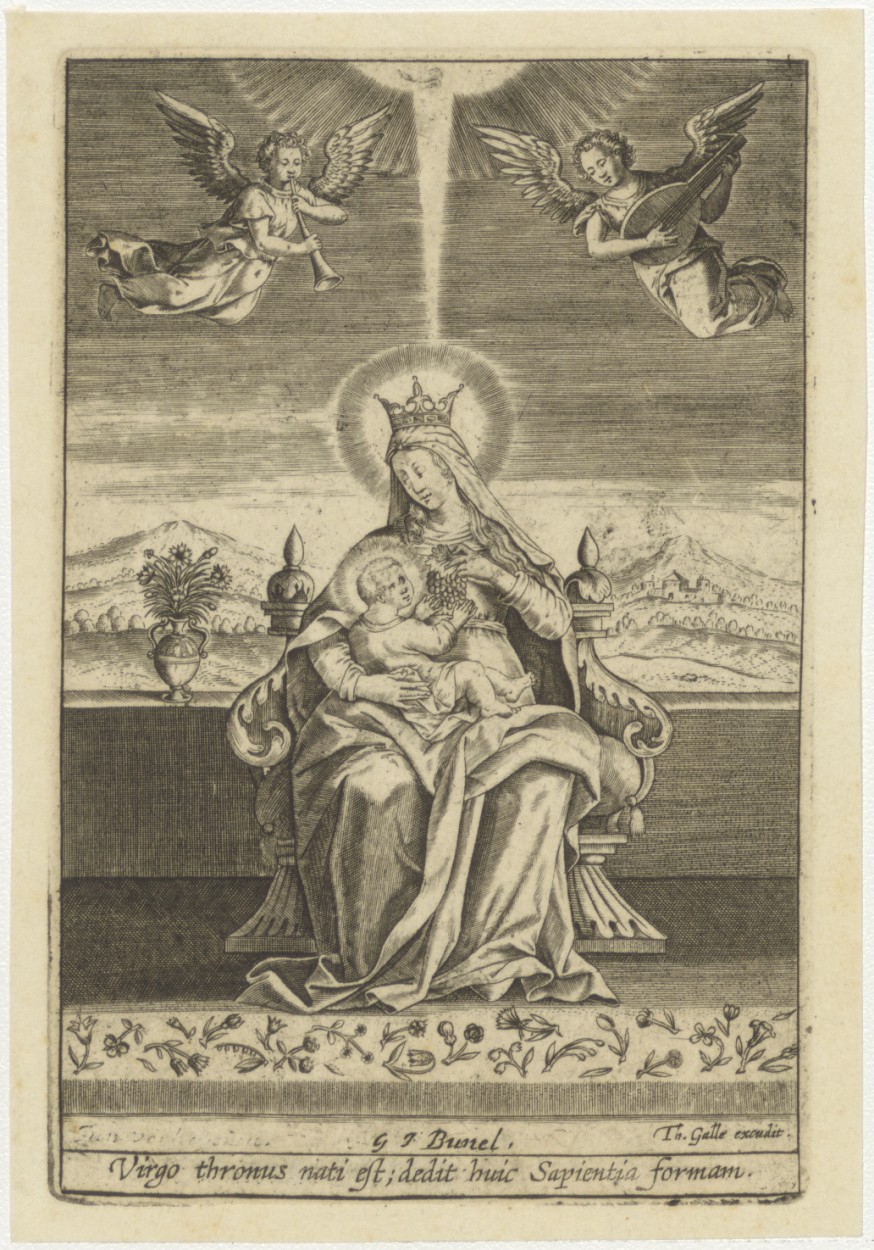 Getroonde Maria met kind met twee musicerende engelen