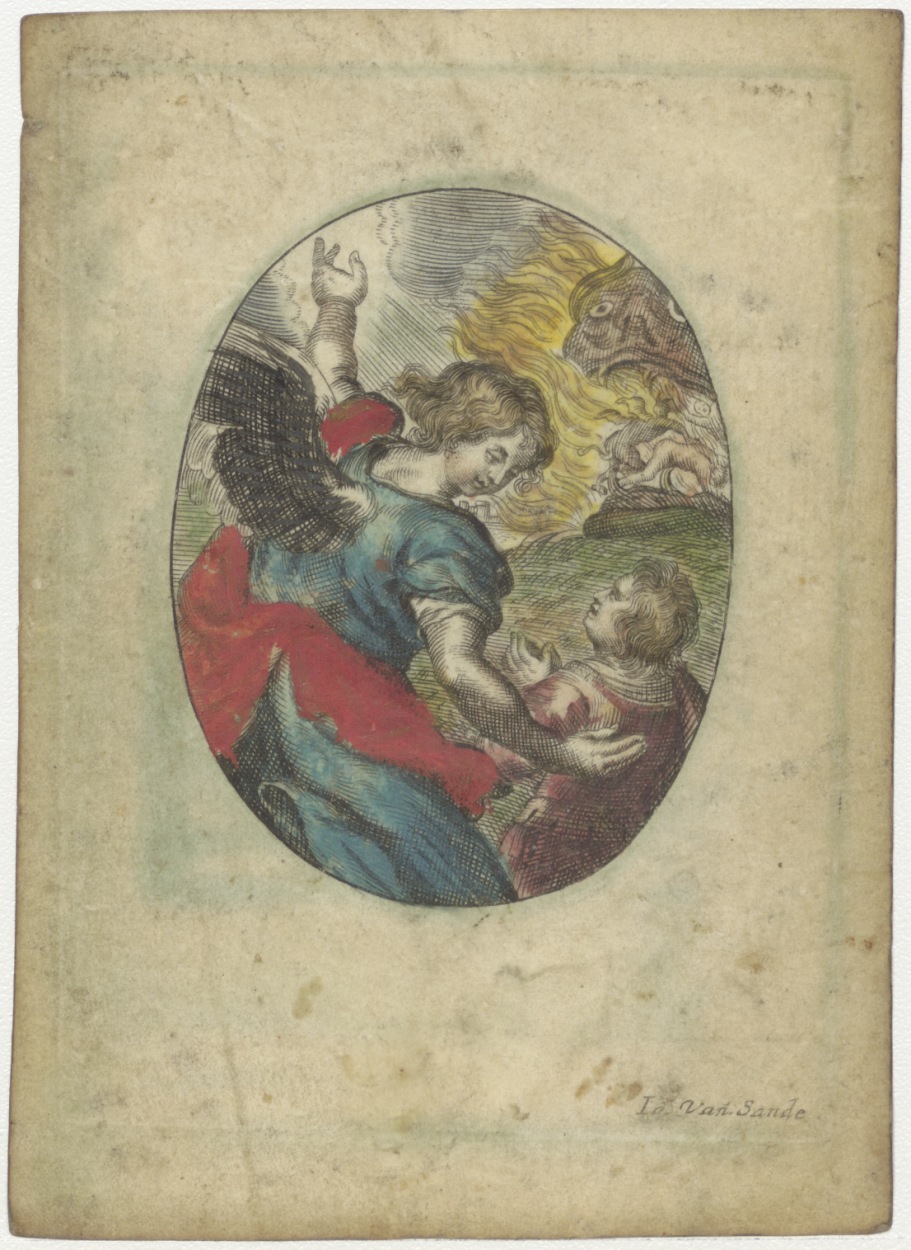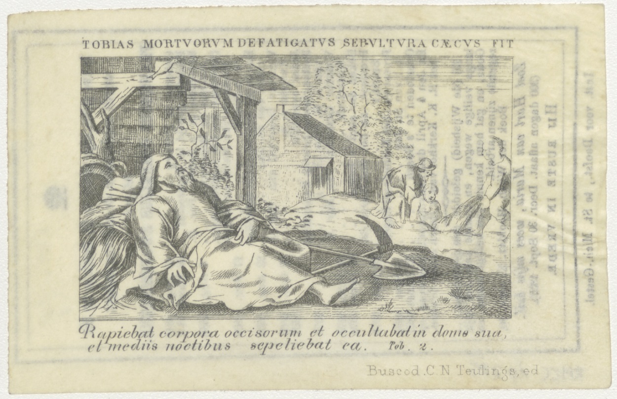 Tobias (Tobit) begraaft de dode man, op achtergrond,...
