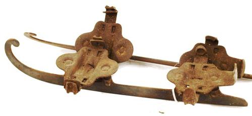 Een set schaatsen van metaal met plateaus waarop de ...