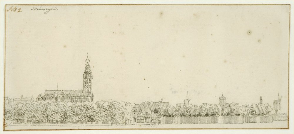 Panorama van Nijmegen, op twee schetsboekblaadjes (a...