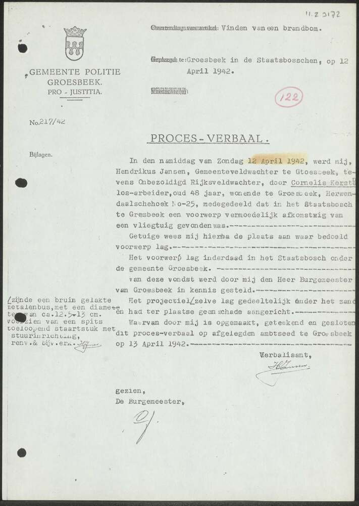Proces-Verbaal Gemeente Groesbeek i.v.m. vinden van ...
