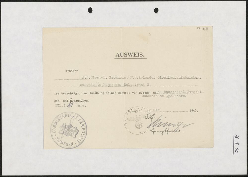 Ausweis A.L. Niesten, 16 mei 1940