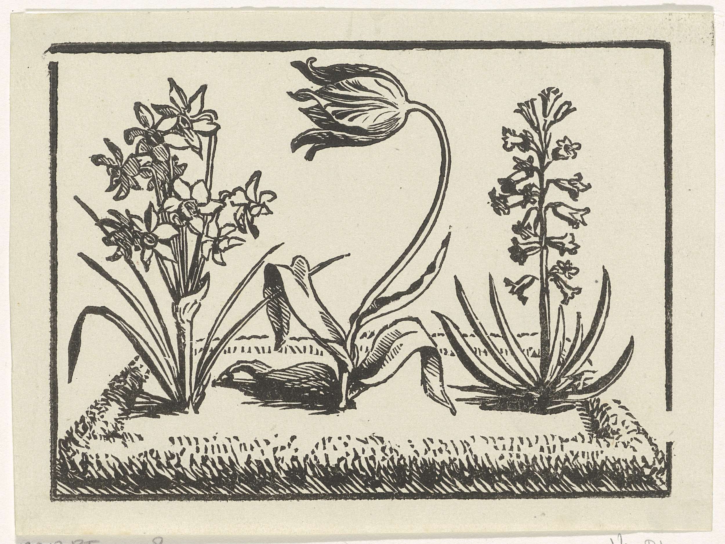 Kleine tuin met een tulp, een narcis en een hyacint