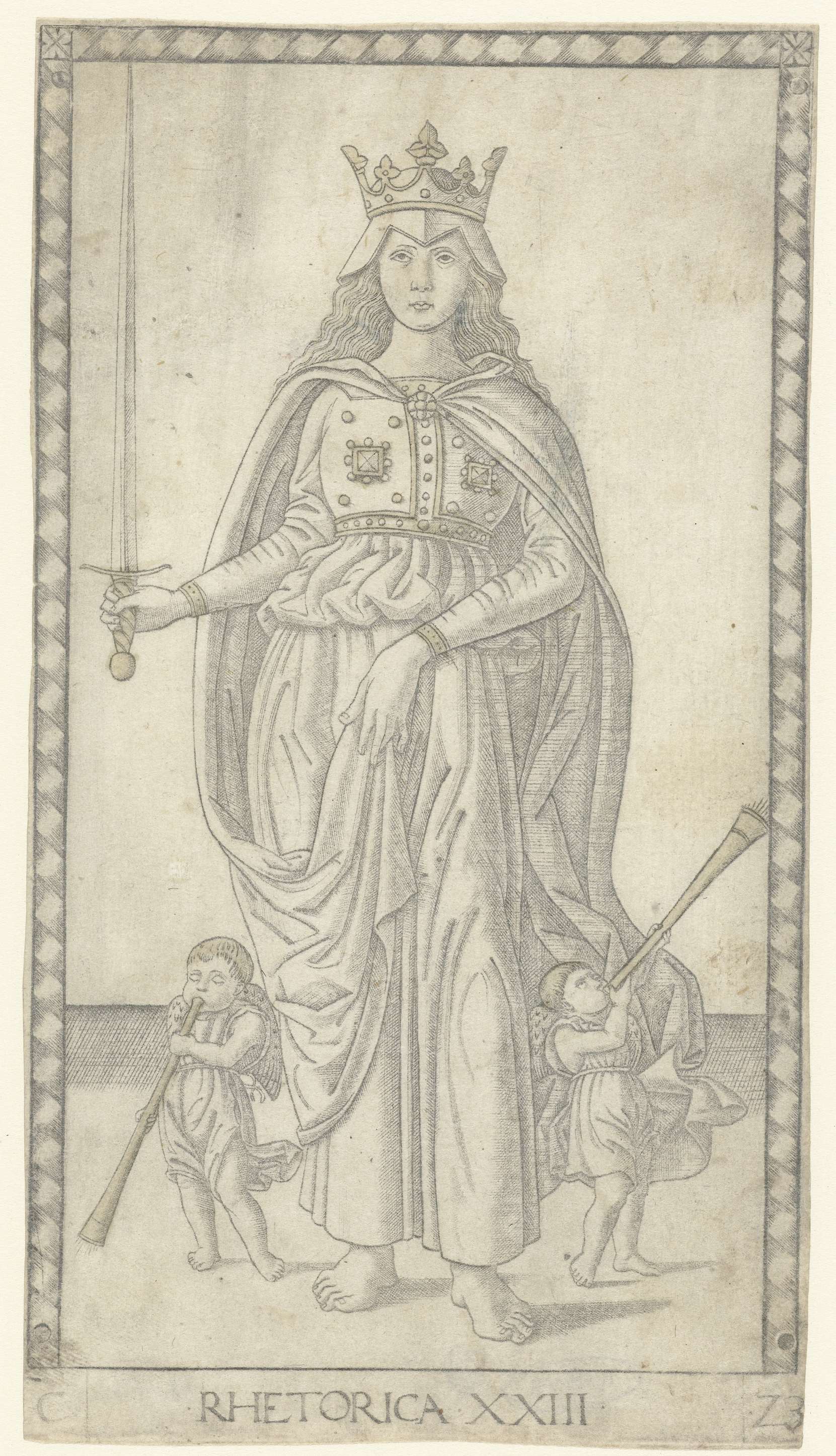 Retorica met zwaard en twee kleine engelen met bazuinen