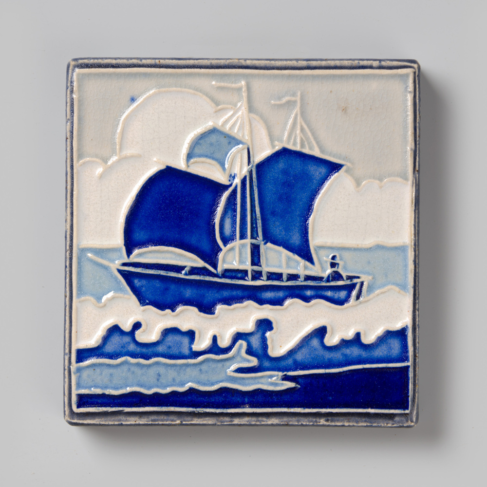 Tegel in cloisonné-techniek, met voorstelling: Schip...