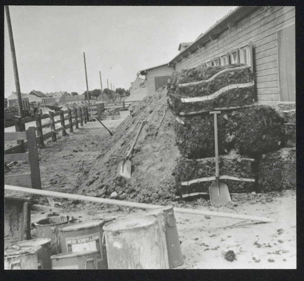 Gebouwen met vooraan een barak waarvoor een aarden w...