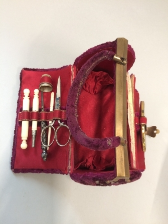 Handwerk-etui van paars fluweel met koper beslag gev...