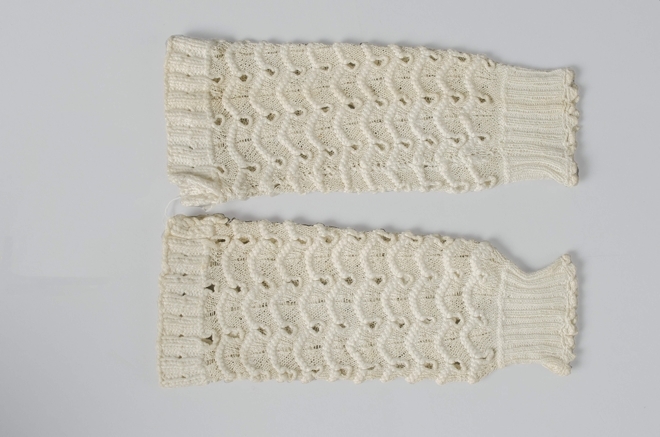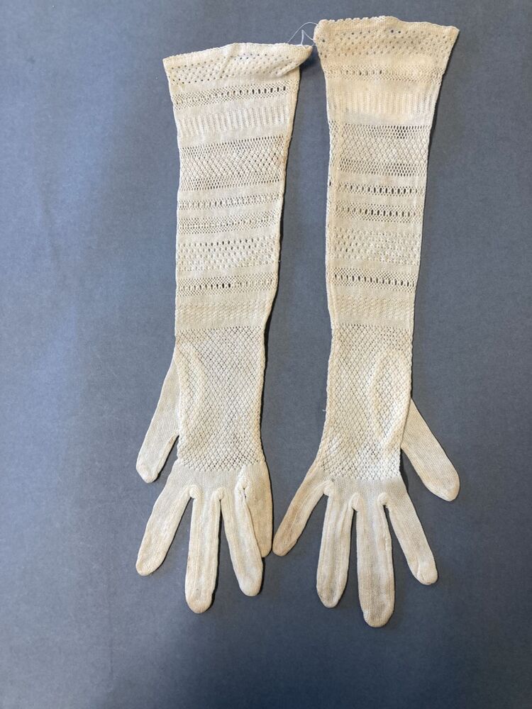 Paar witte katoenen machinaal gebreide handschoenen,...