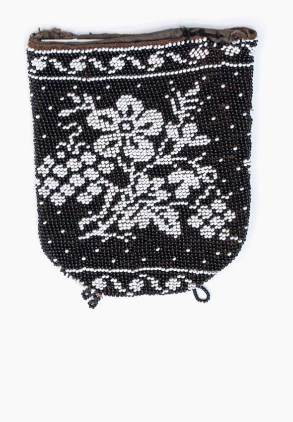Rouwbeurs van kralen breiwerk, gevoerd met bruin kat...