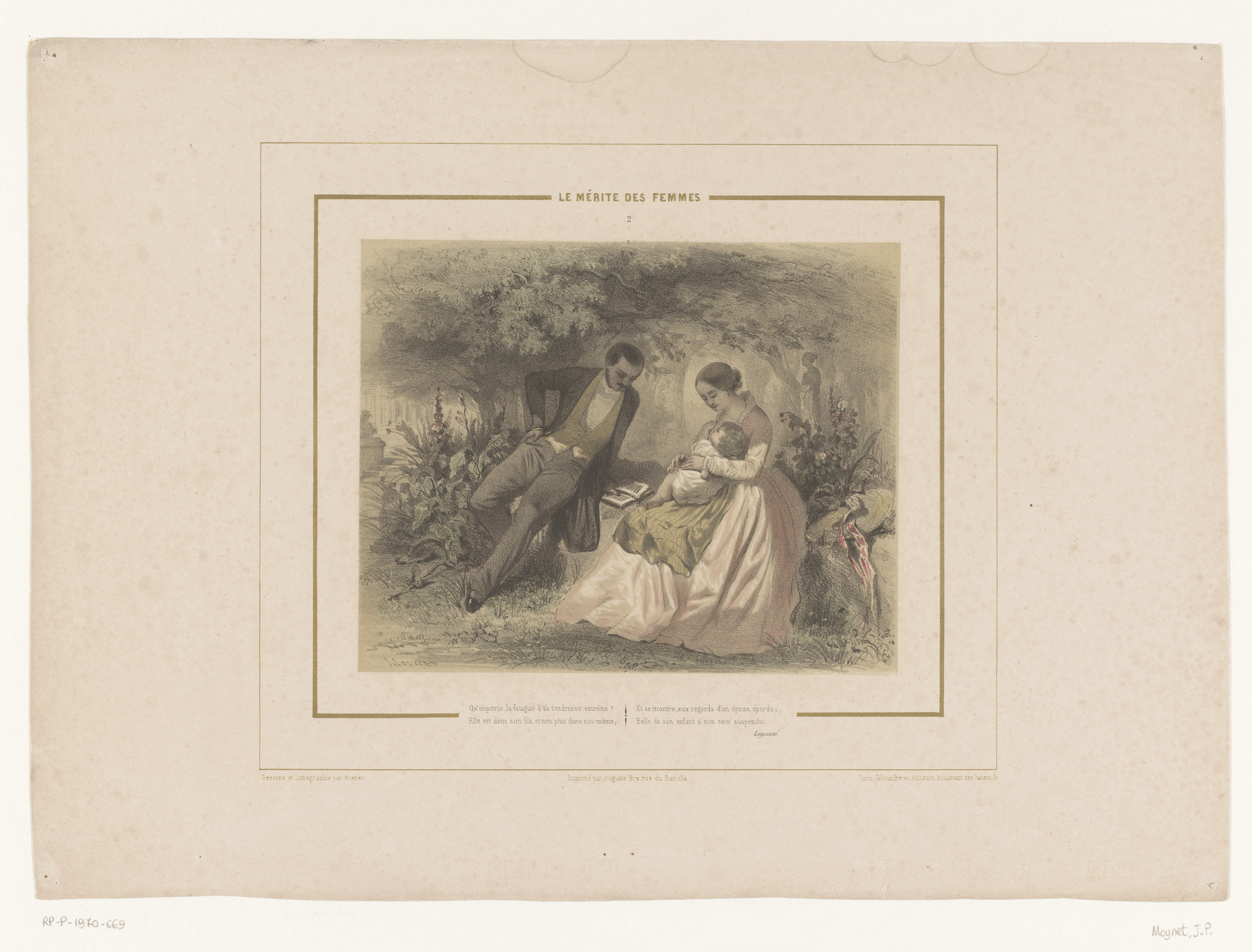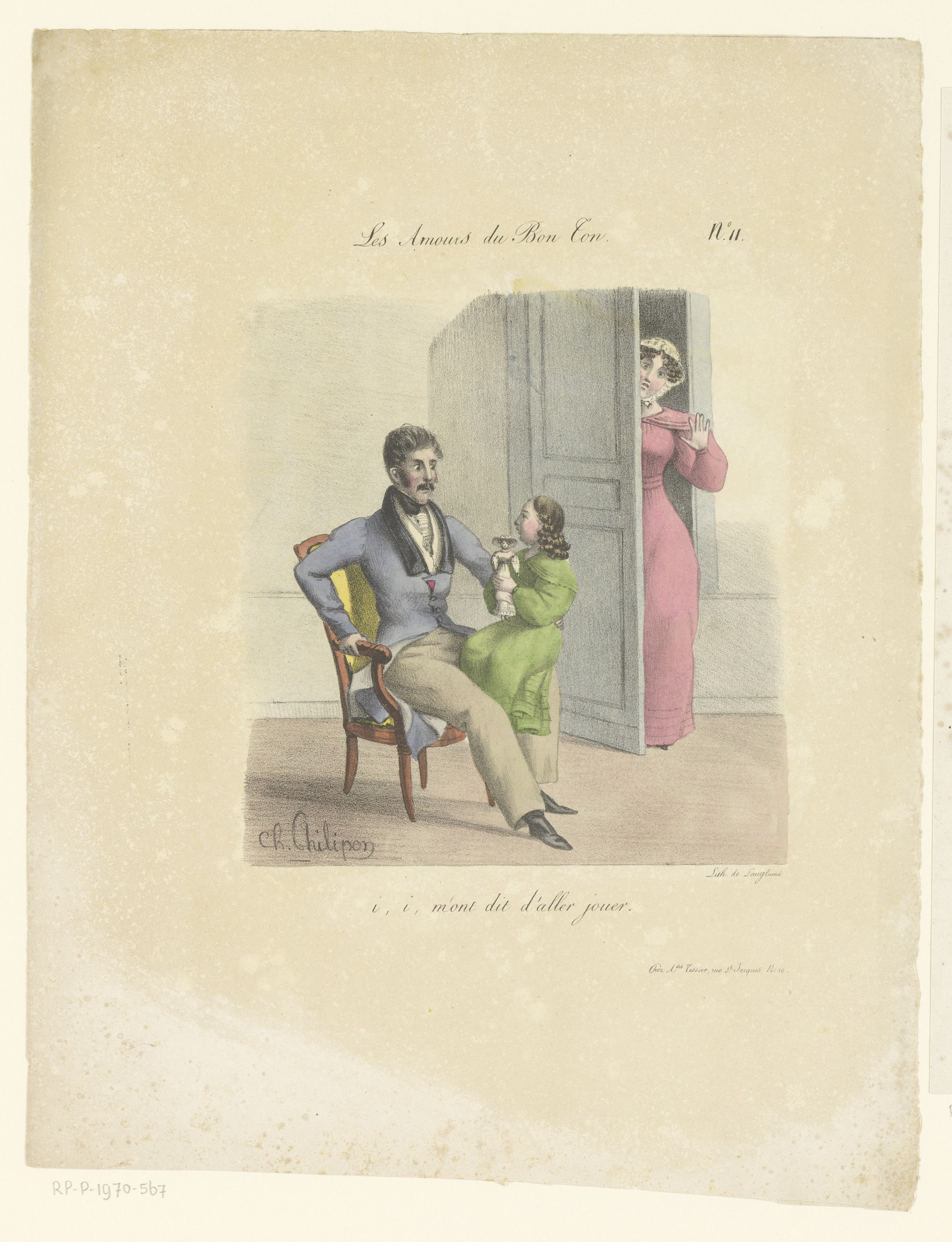 Man met kind op zijn knie, vrouw kijkt achter de deur