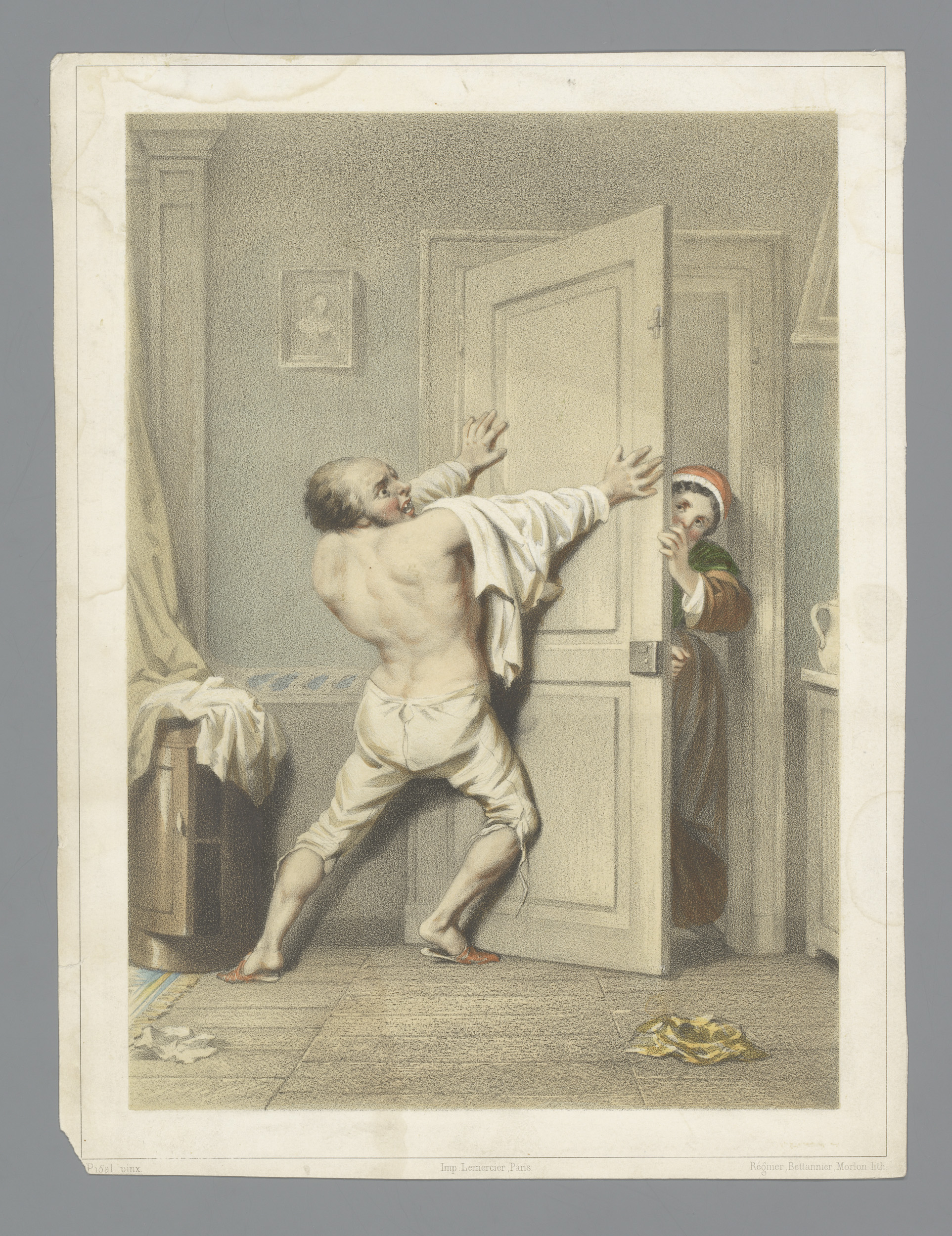 Half ontklede man duwt deur dicht voor binnenkomend ...