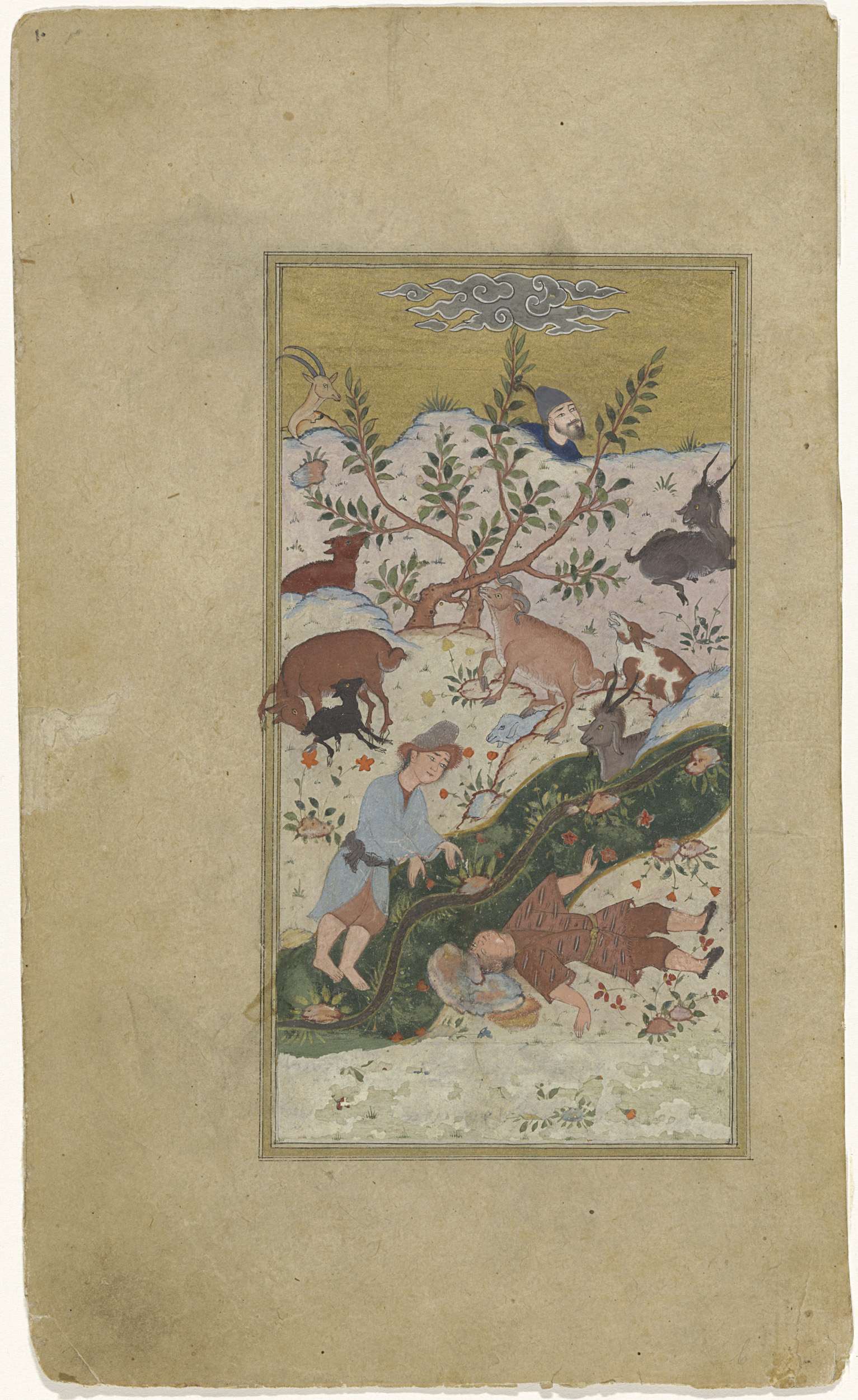Krishna bestrijdt de slang Kalya terwijl vier herder...