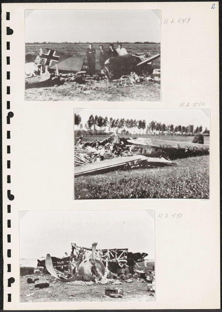 Foto wrak Duitse bommenwerper in weiland. Tekst: "De...