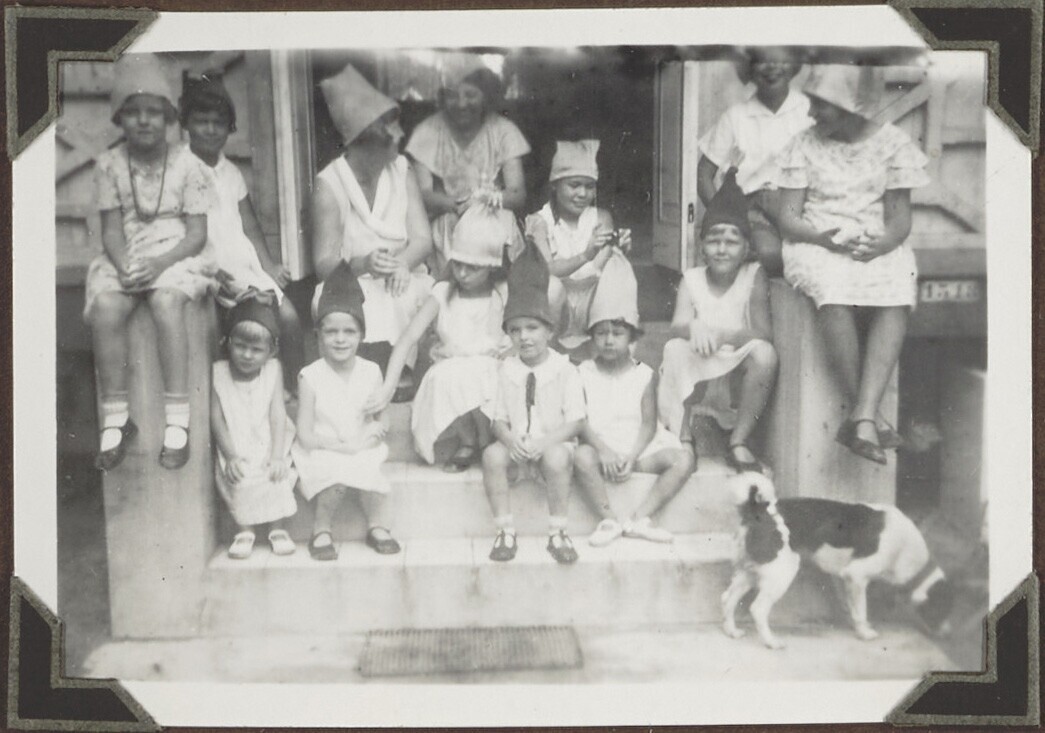 Portret van mannen, vrouwen en kinderen op de trap v...