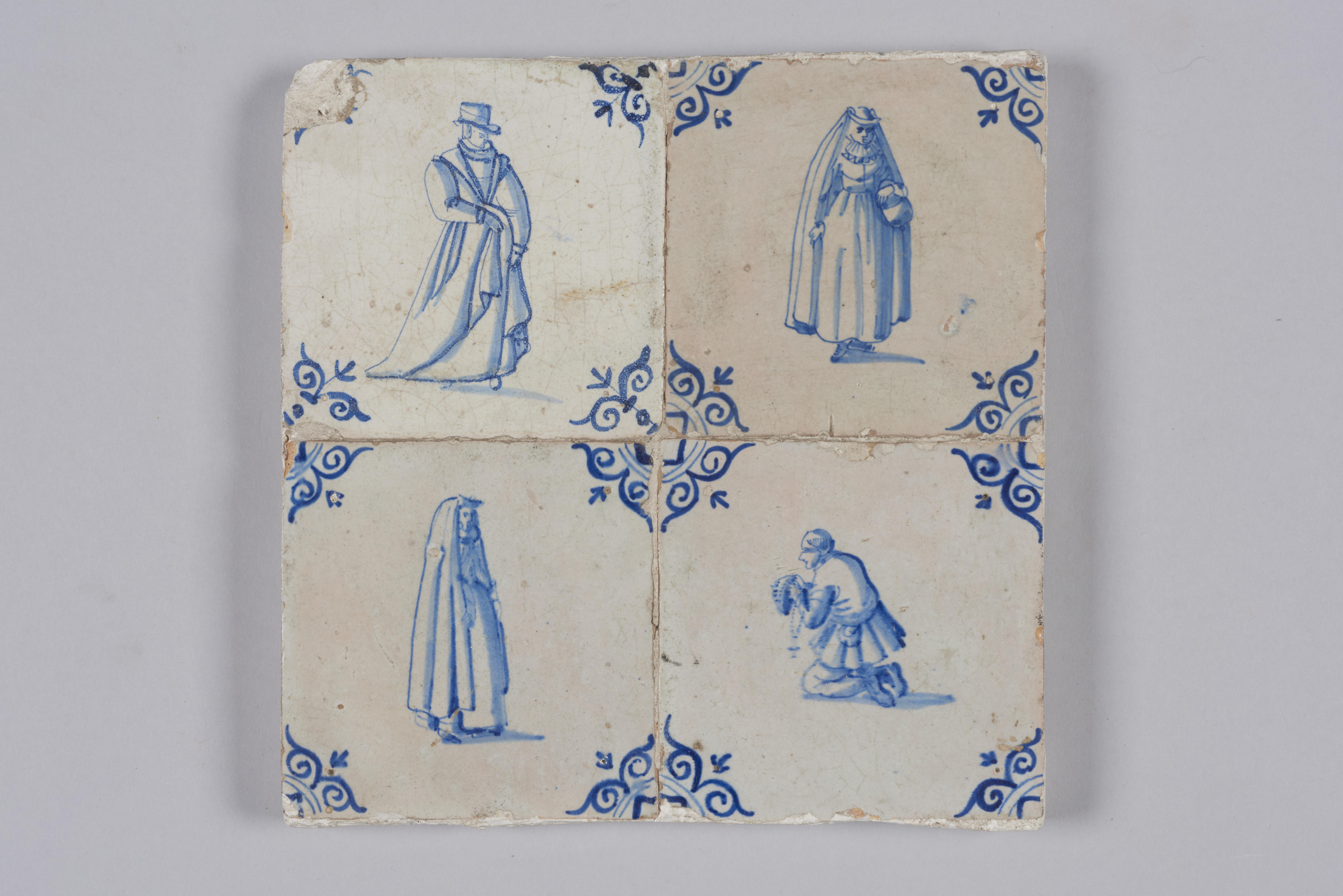 Vier wandtegels met afbeelding mensfiguur, 1600–1700