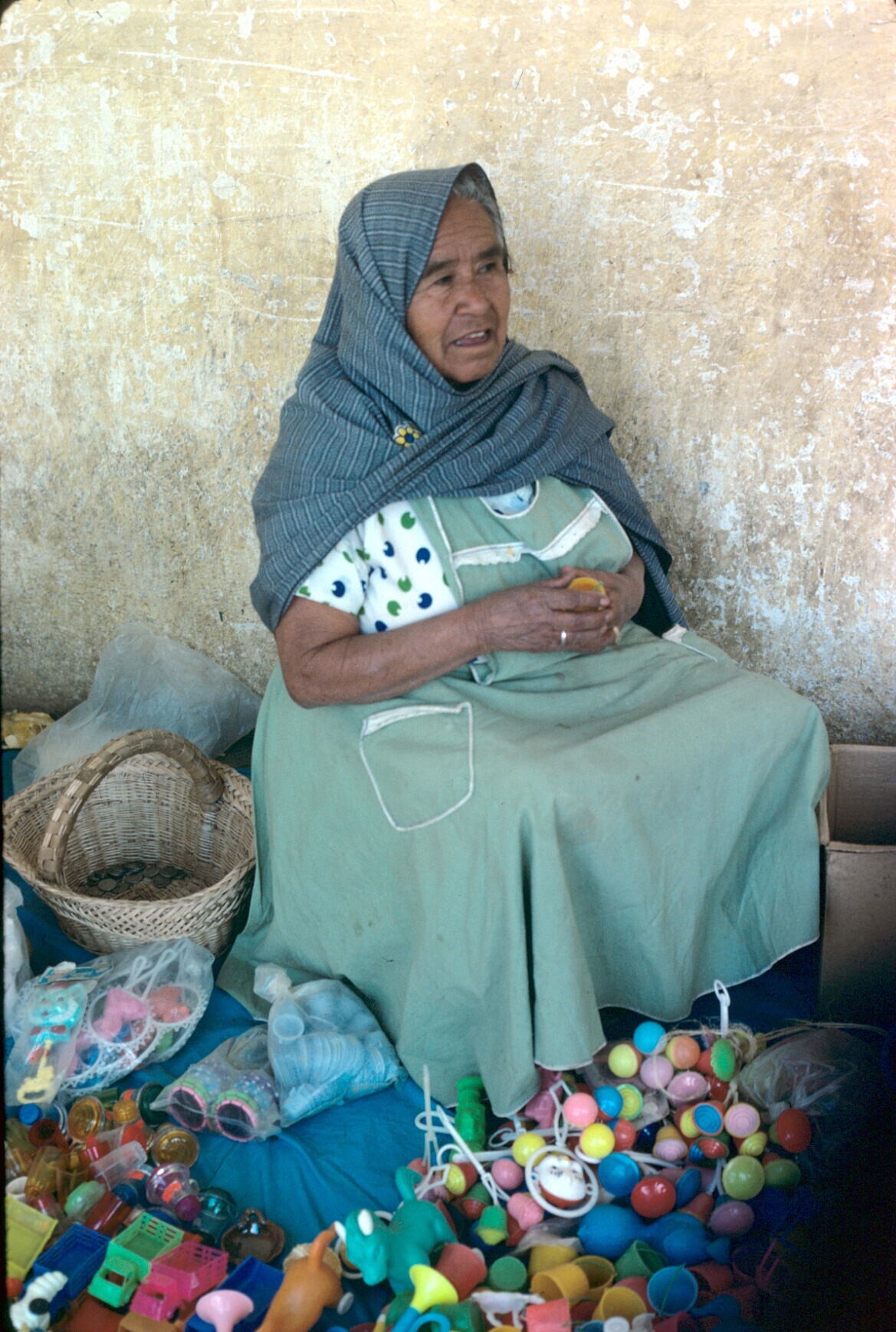 marktkoopvrouw met plastic speelgoed