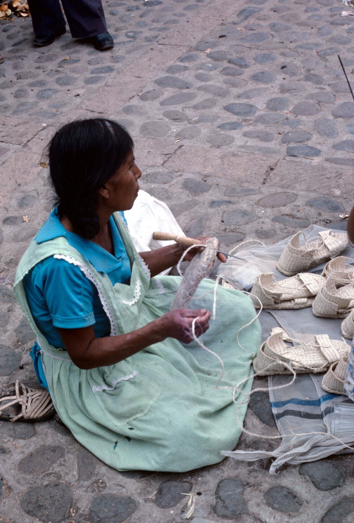 vrouw, ixcactles (sandalen) vlechtend