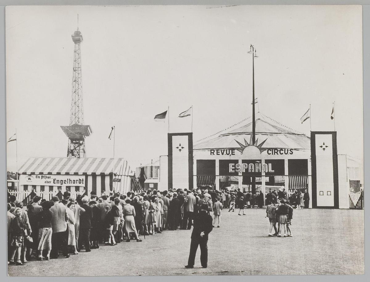 Publiek in de rij voor Circus Mikkenie. Revue Circus...