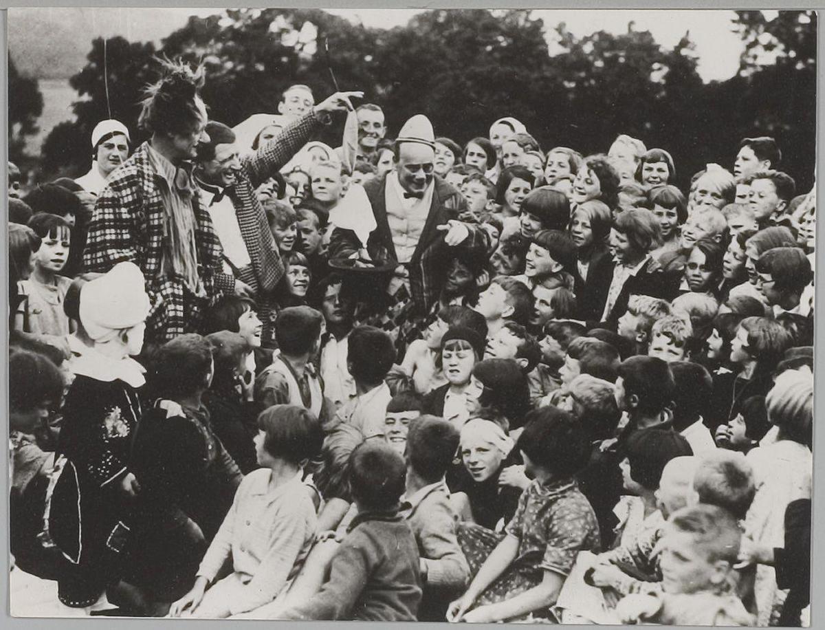 Clowns met kinderen. Circus Bertram Mills. Ong. 1953